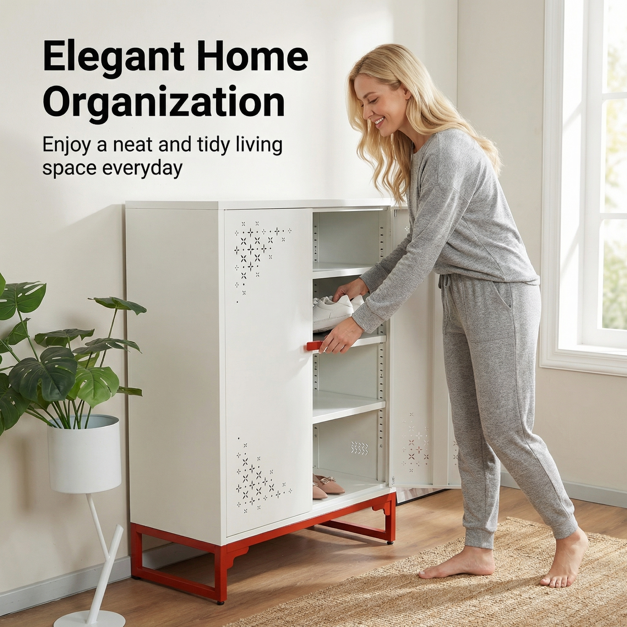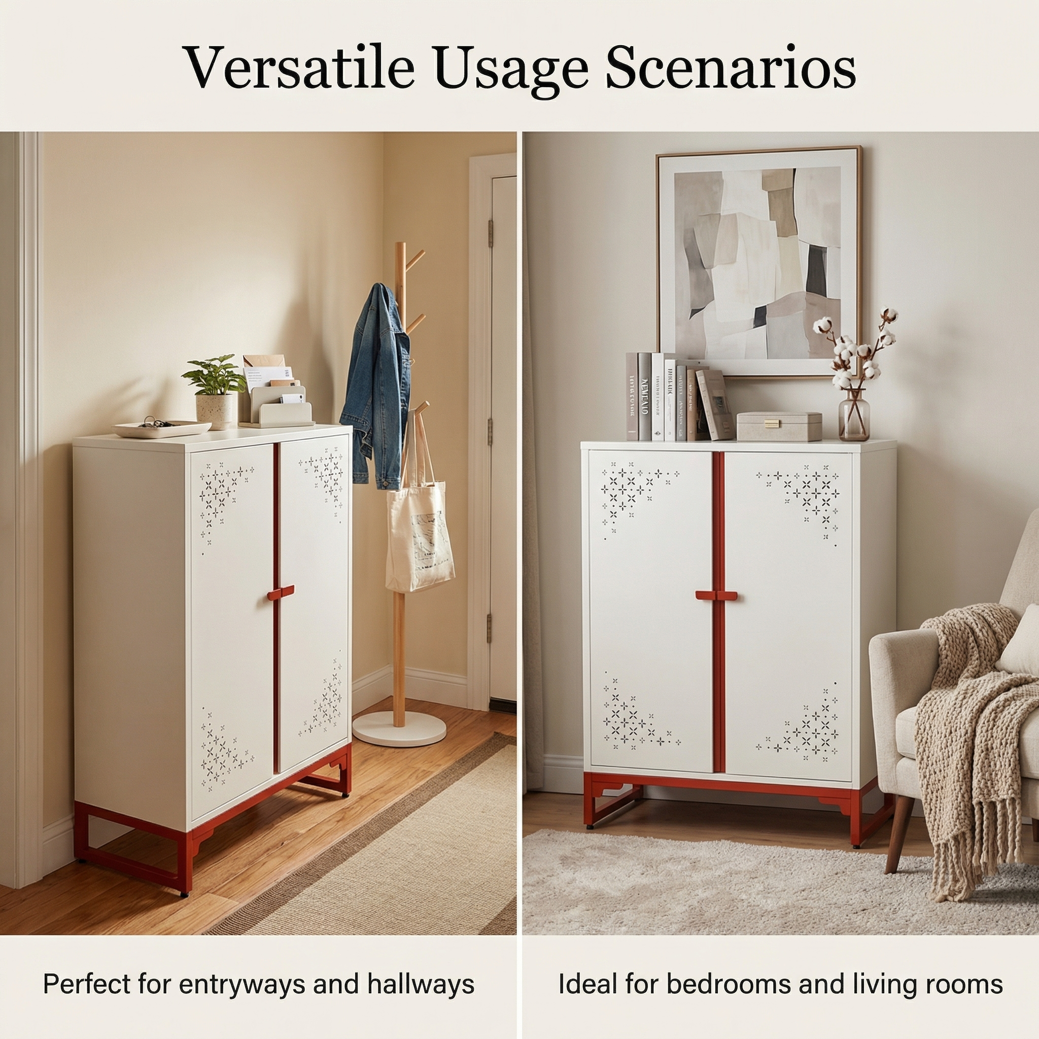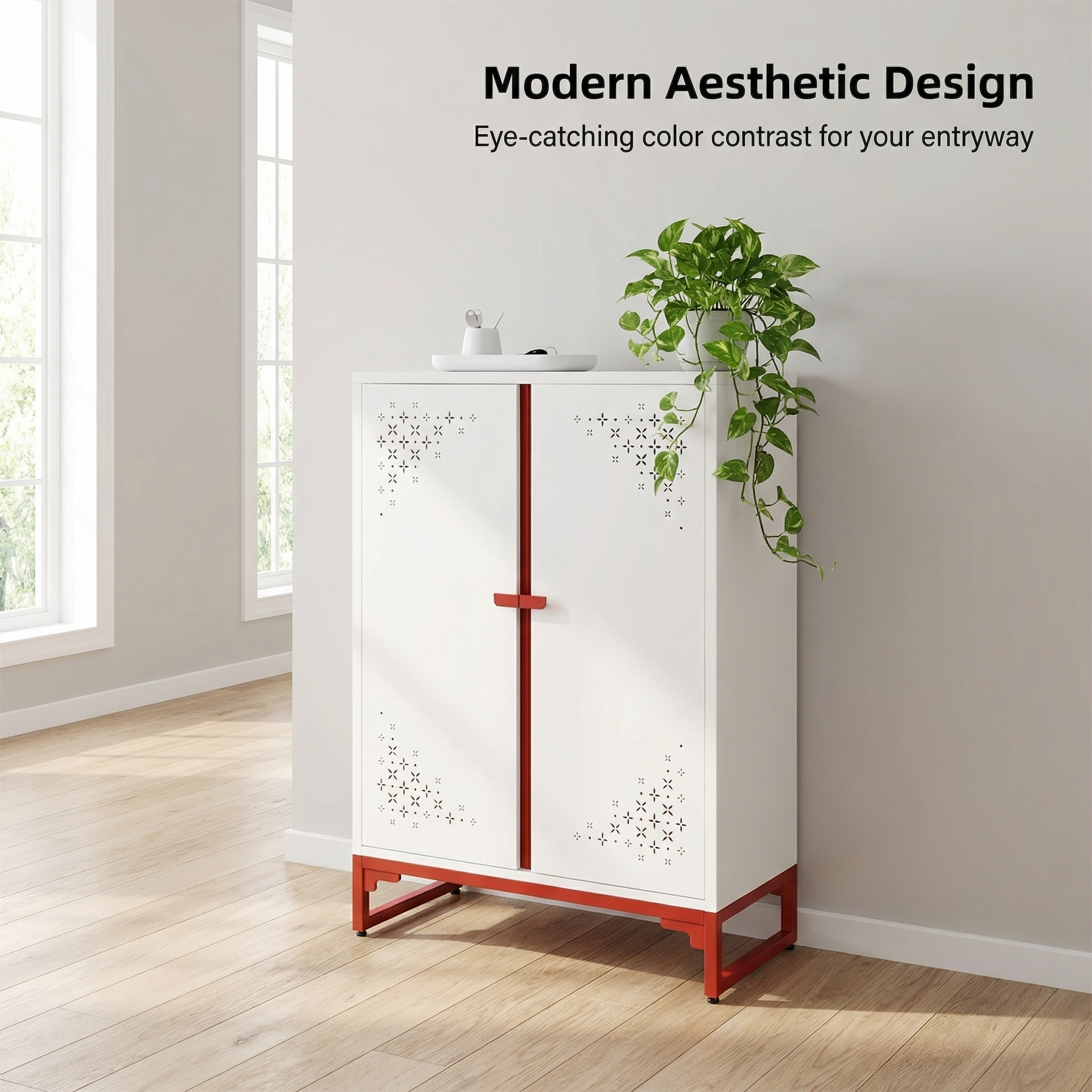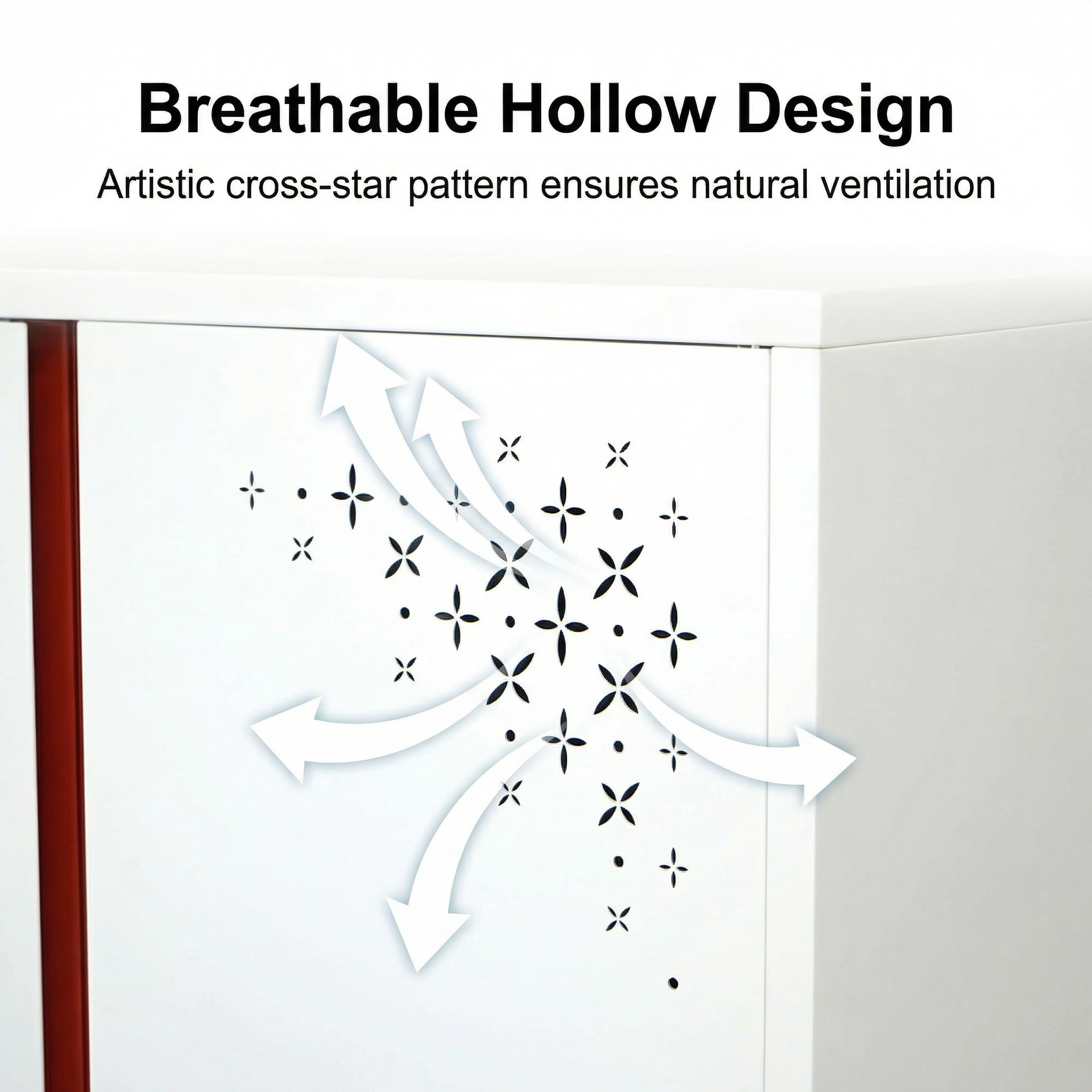 Description:White & Red/Pink 2-door Steel Storage Cabinet, Four-leaf Hollow Carved, Color-blocking Base, New Chinese Style Home Cabinet