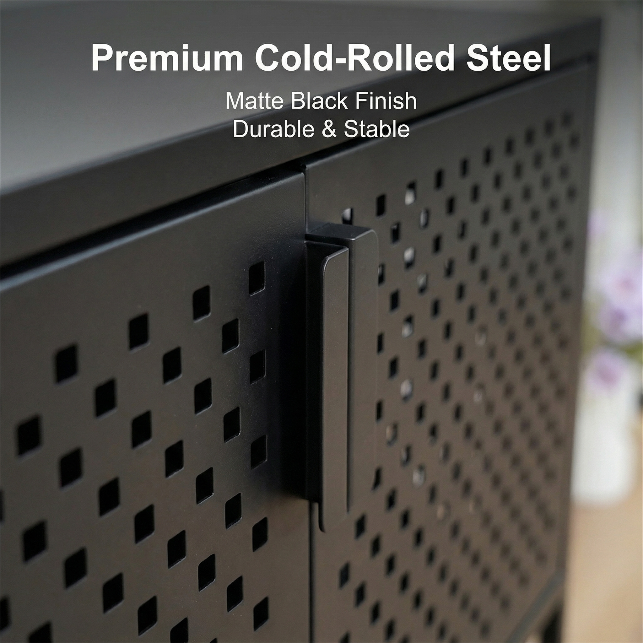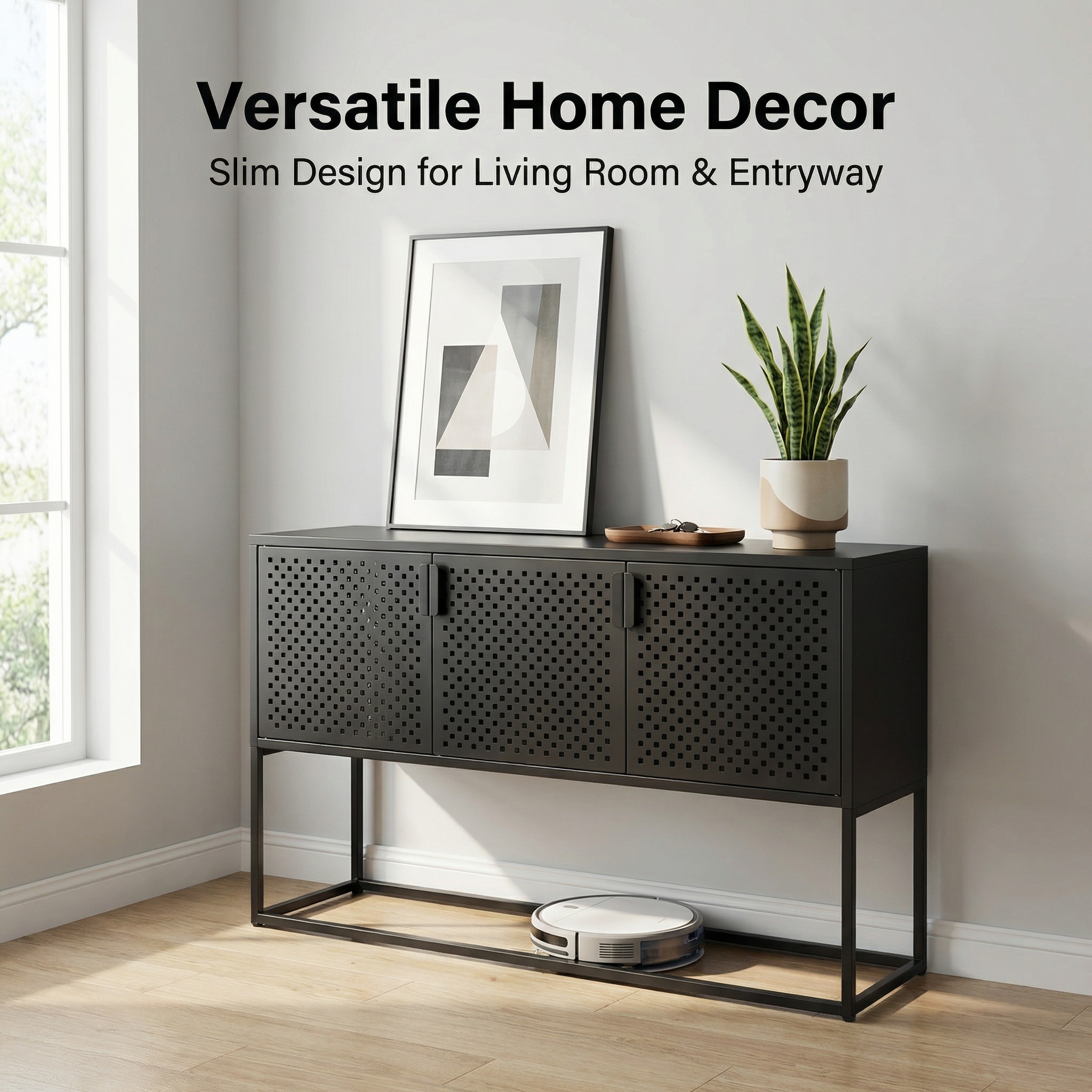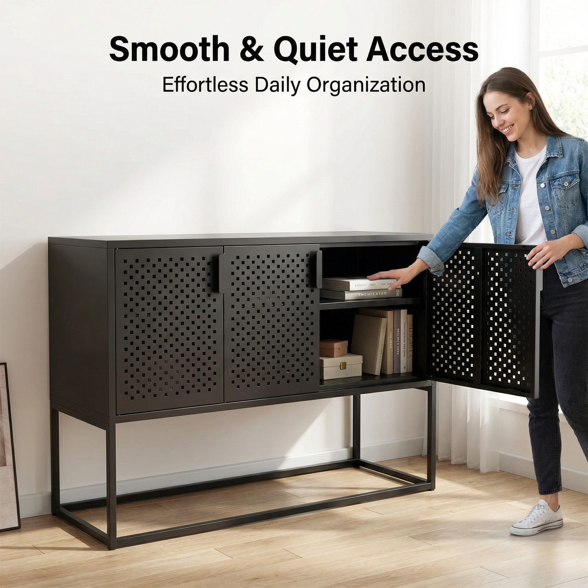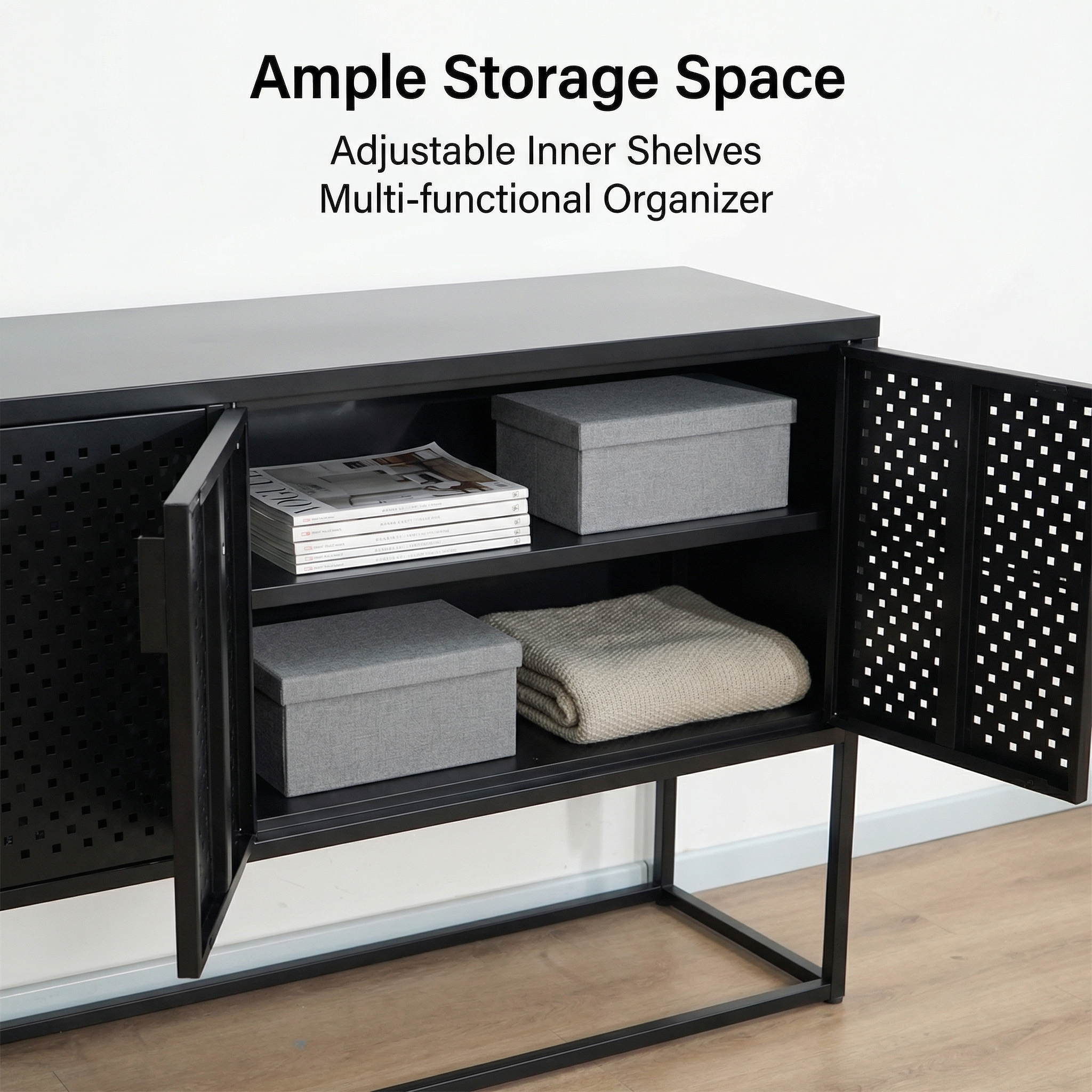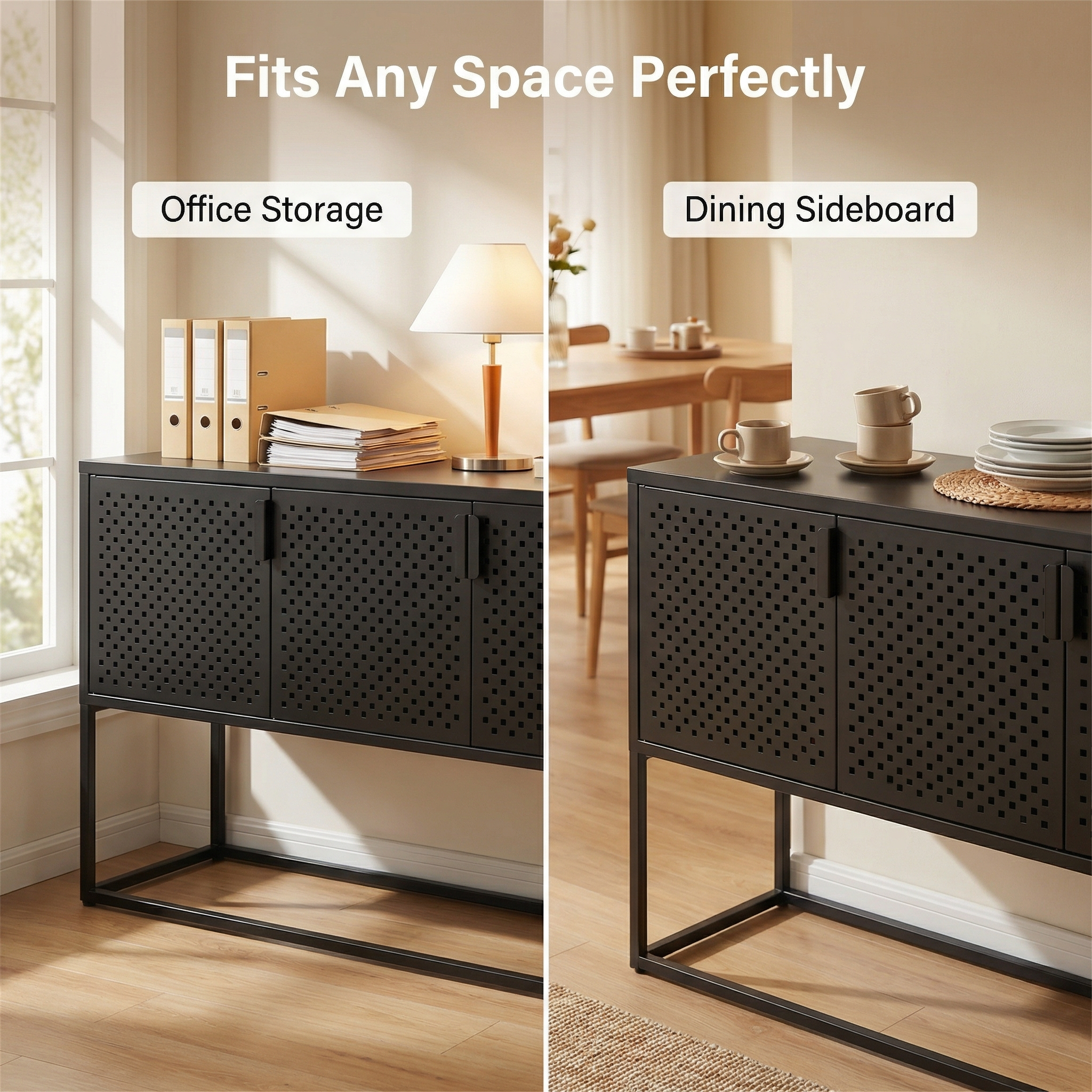 Description:Black metal sideboard with 3 perforated doors, adjustable shelf, open metal base, modern industrial storage cabinet for living room & dining room.
