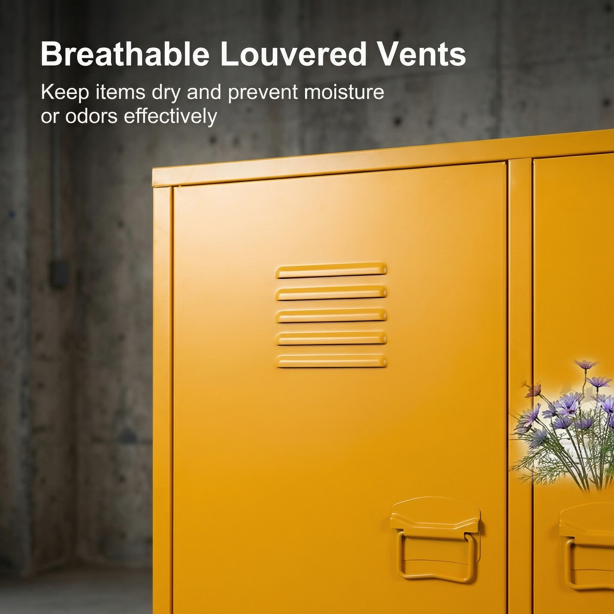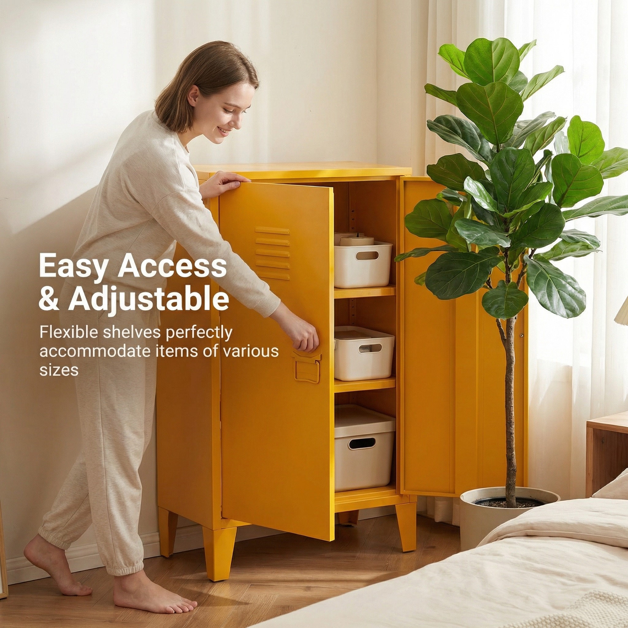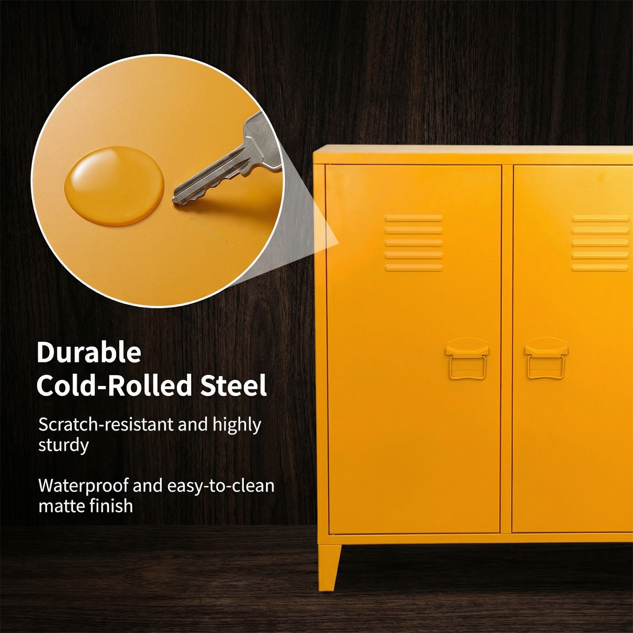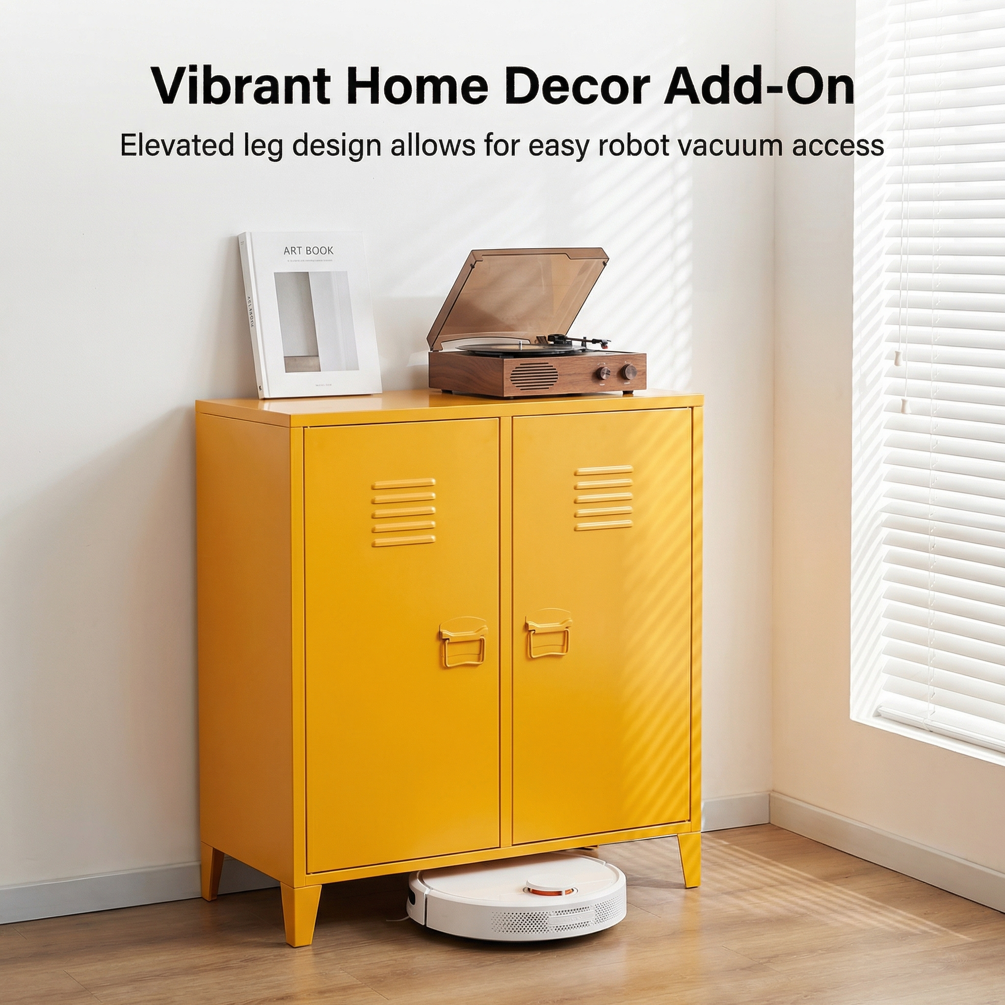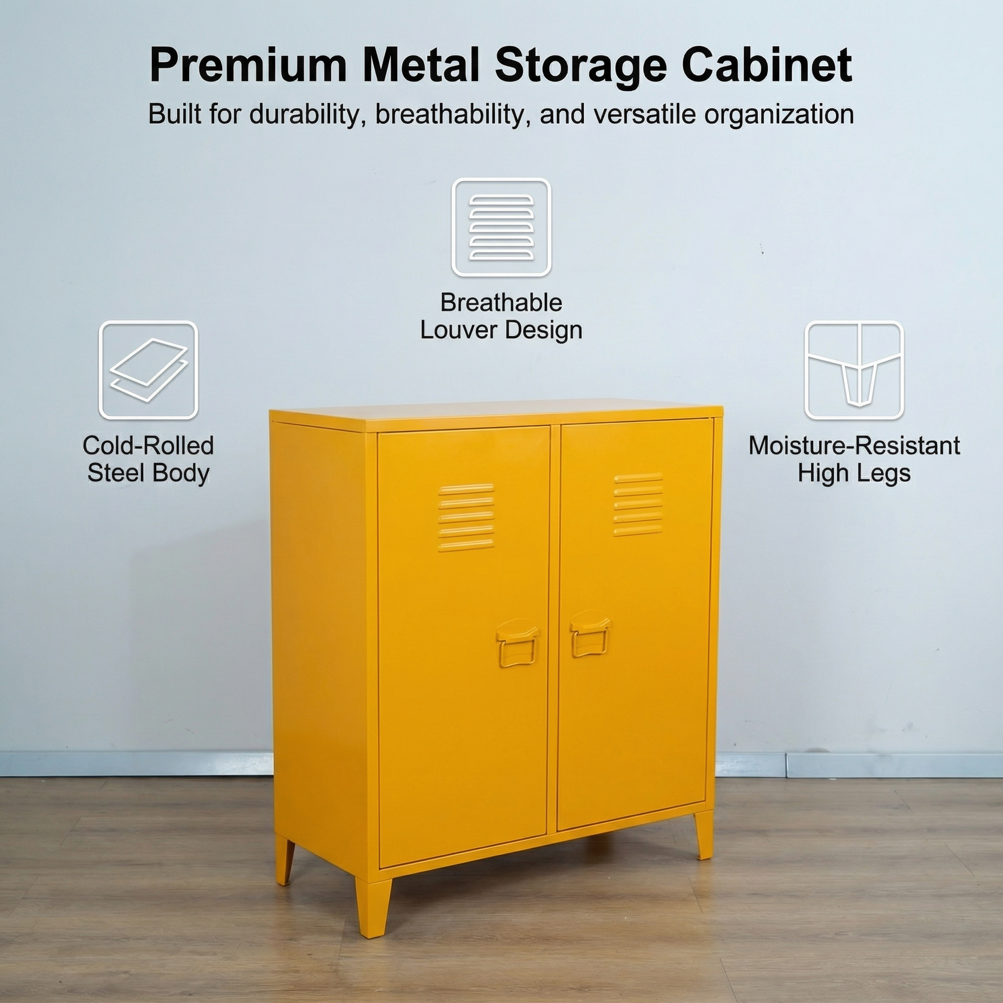 Description:Bright Yellow 2-door Metal Storage Cabinet, Industrial Style, Ventilated Door, High Legs, Home & Office Sideboard