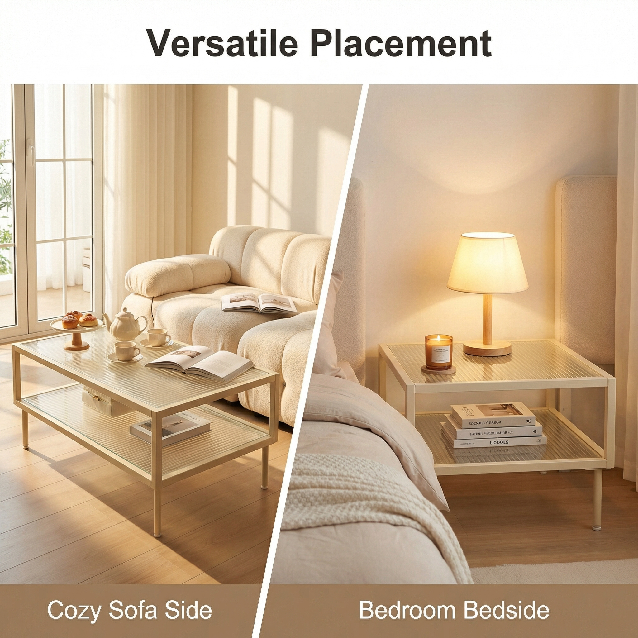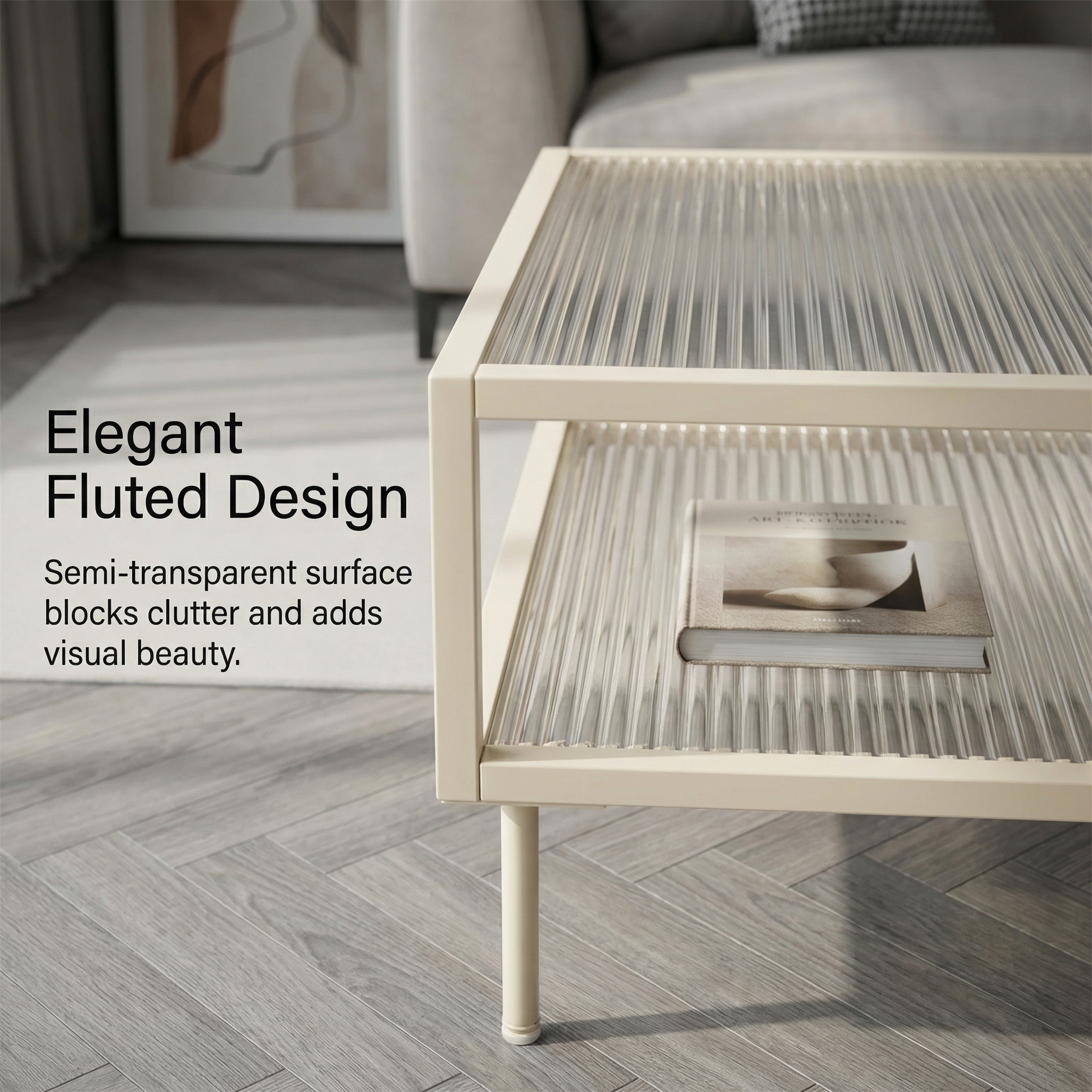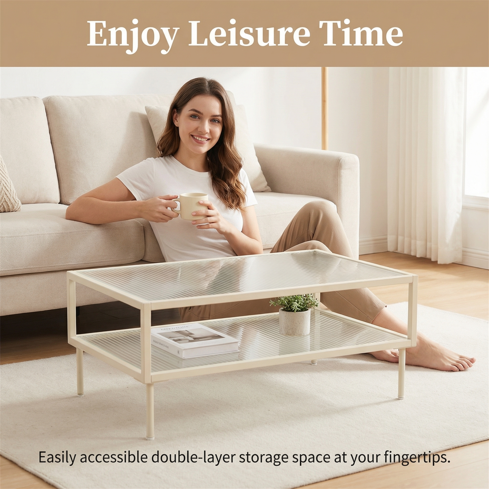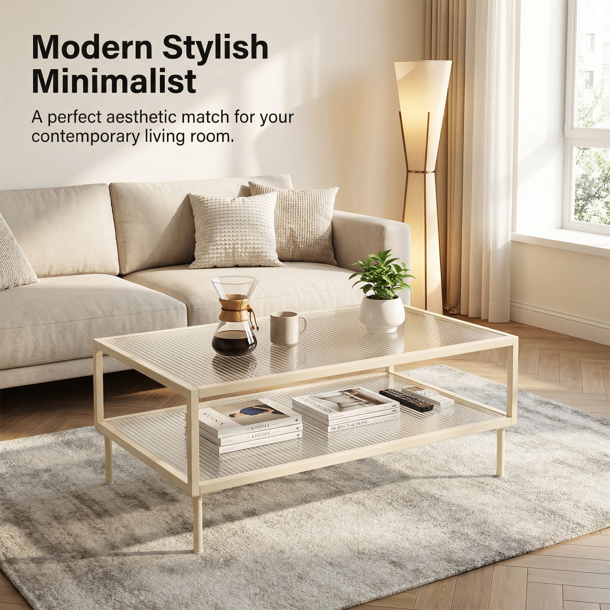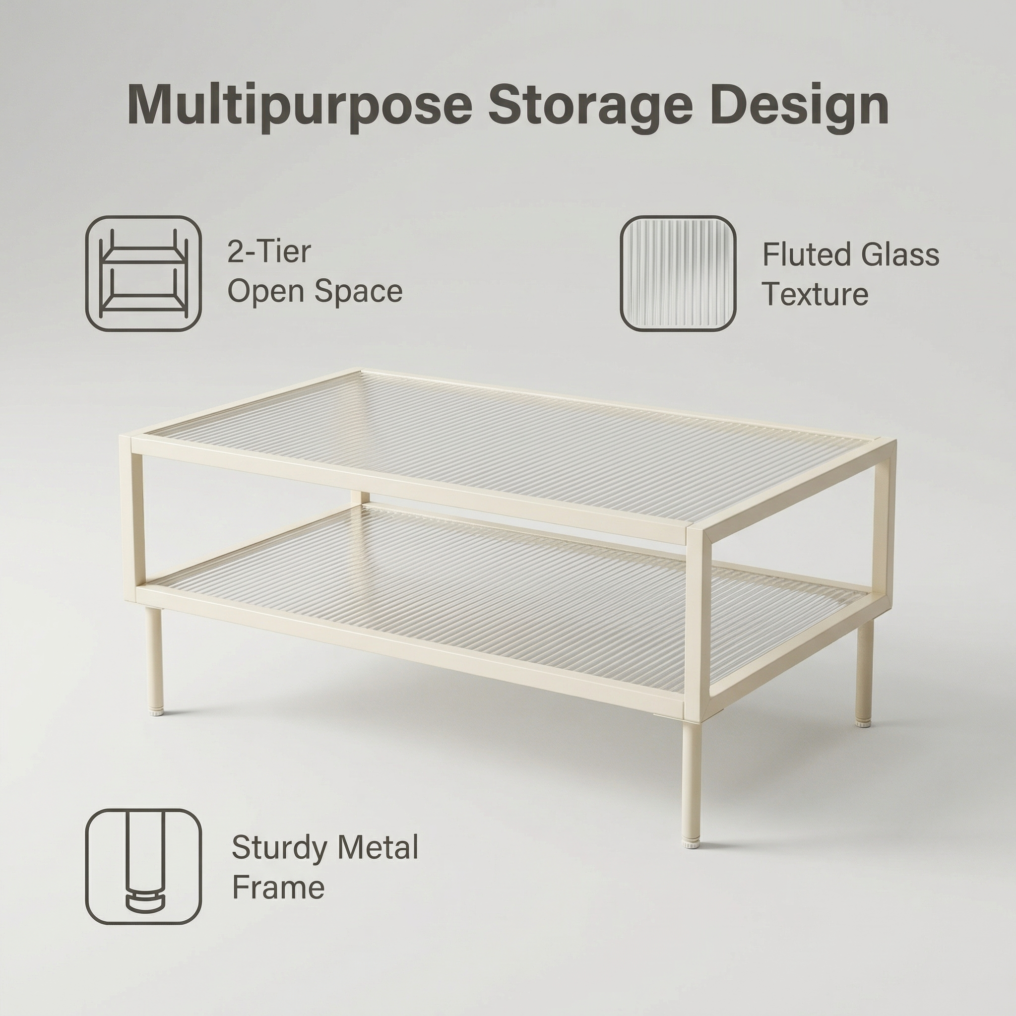 Description:Cream white metal coffee table with 2-tier fluted glass top, minimalist open frame, adjustable foot pads, modern stylish for living room.
