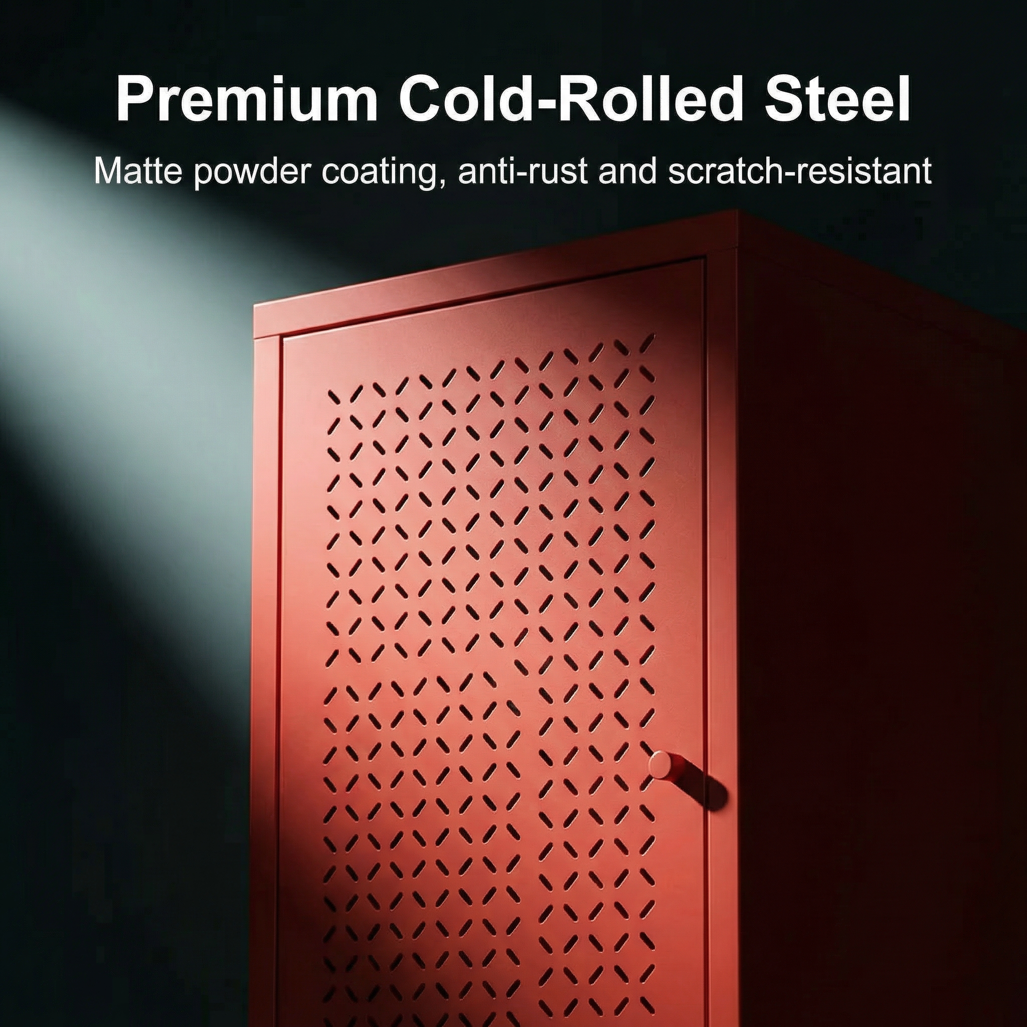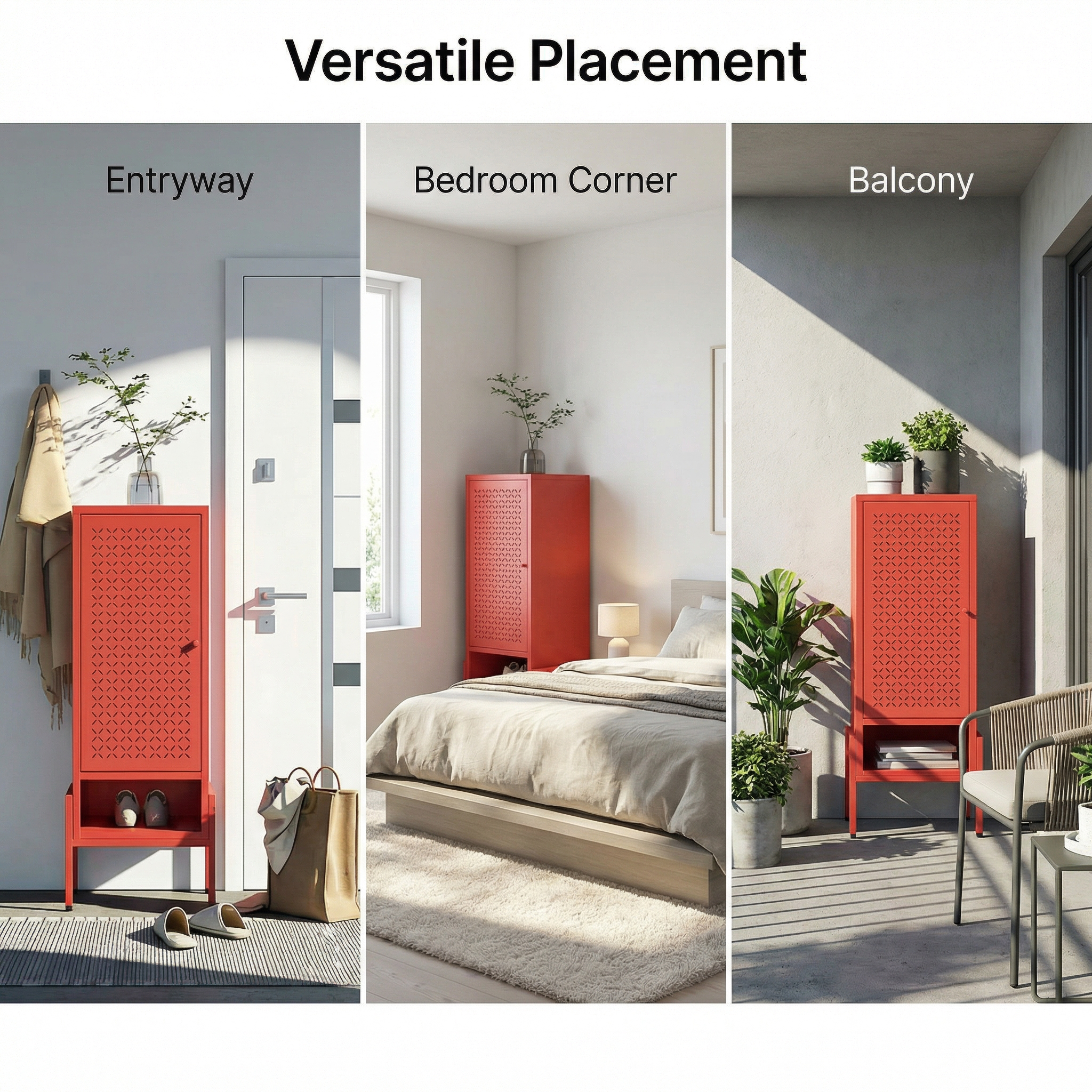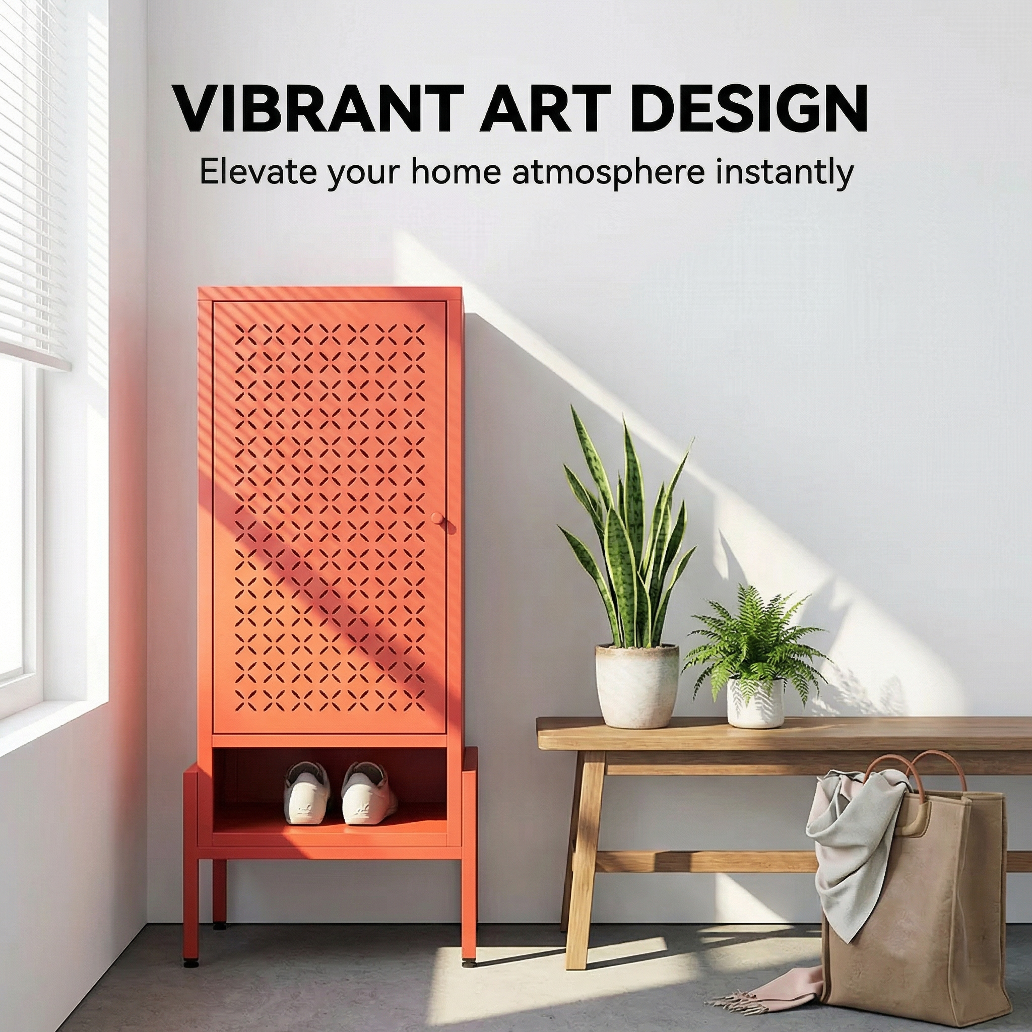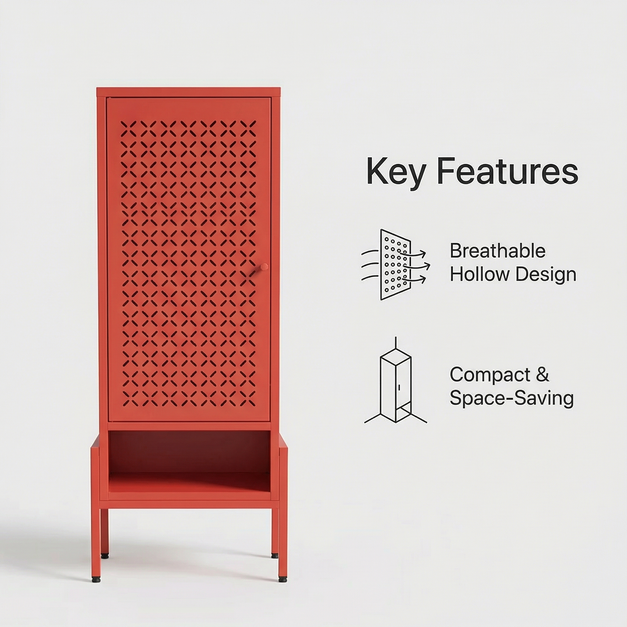 Description: Single-door steel shoe cabinet, Luxury hollow punched all-steel shoe cabinet with elevated legs for moisture-proof and easy cleaning. Features bottom open storage, available in solid & two-tone colors, space-saving slim body, combines dust-proof, ventilation, storage and decoration.