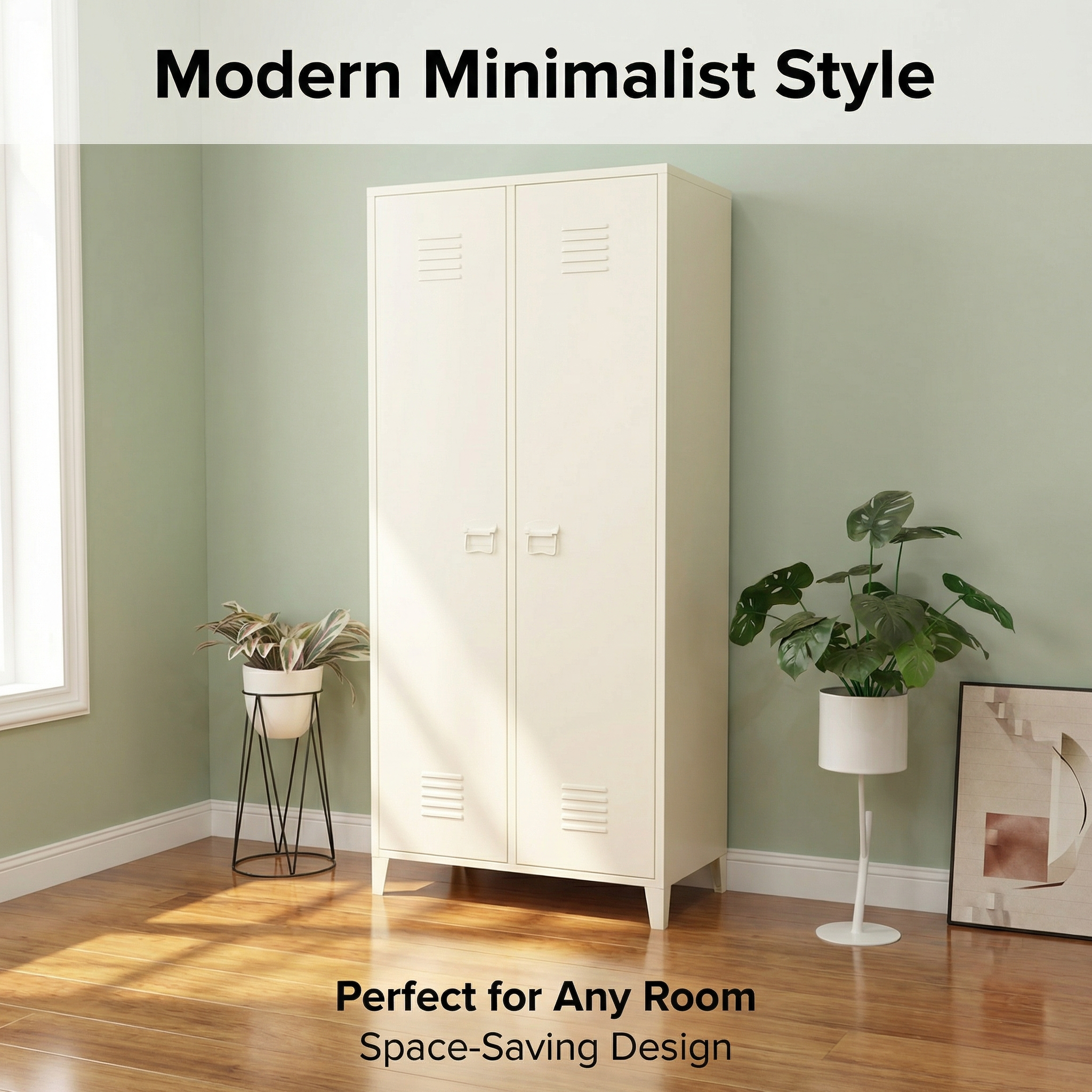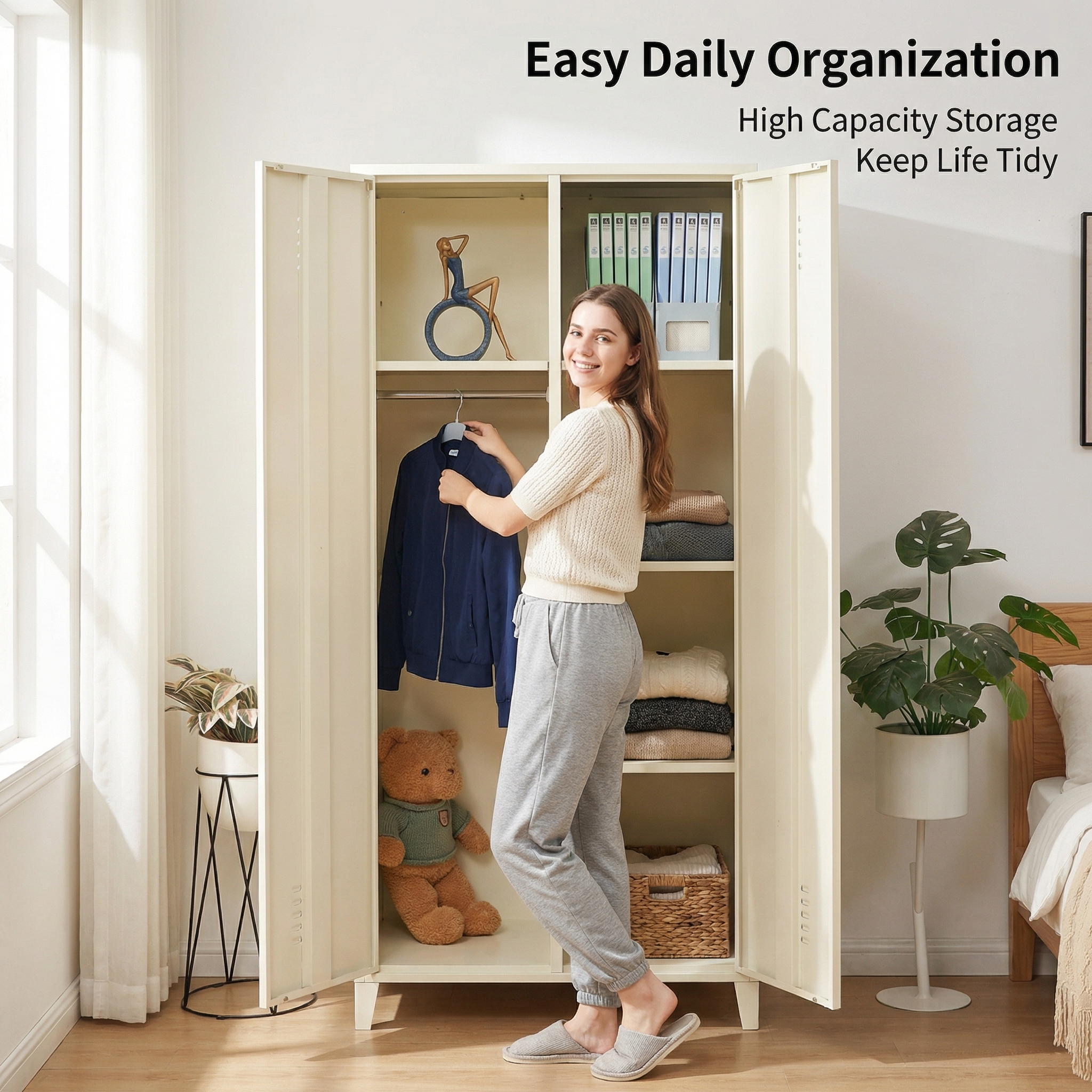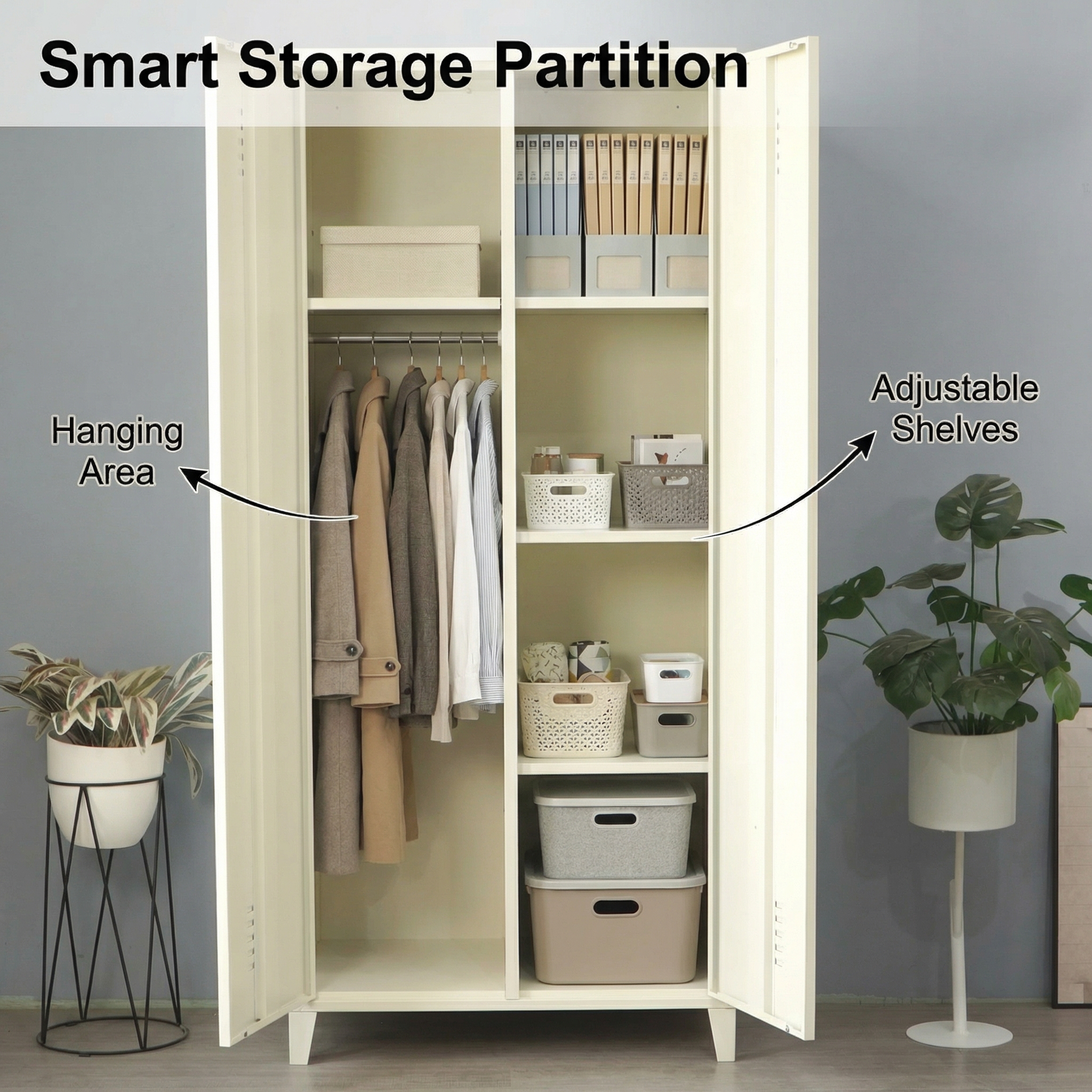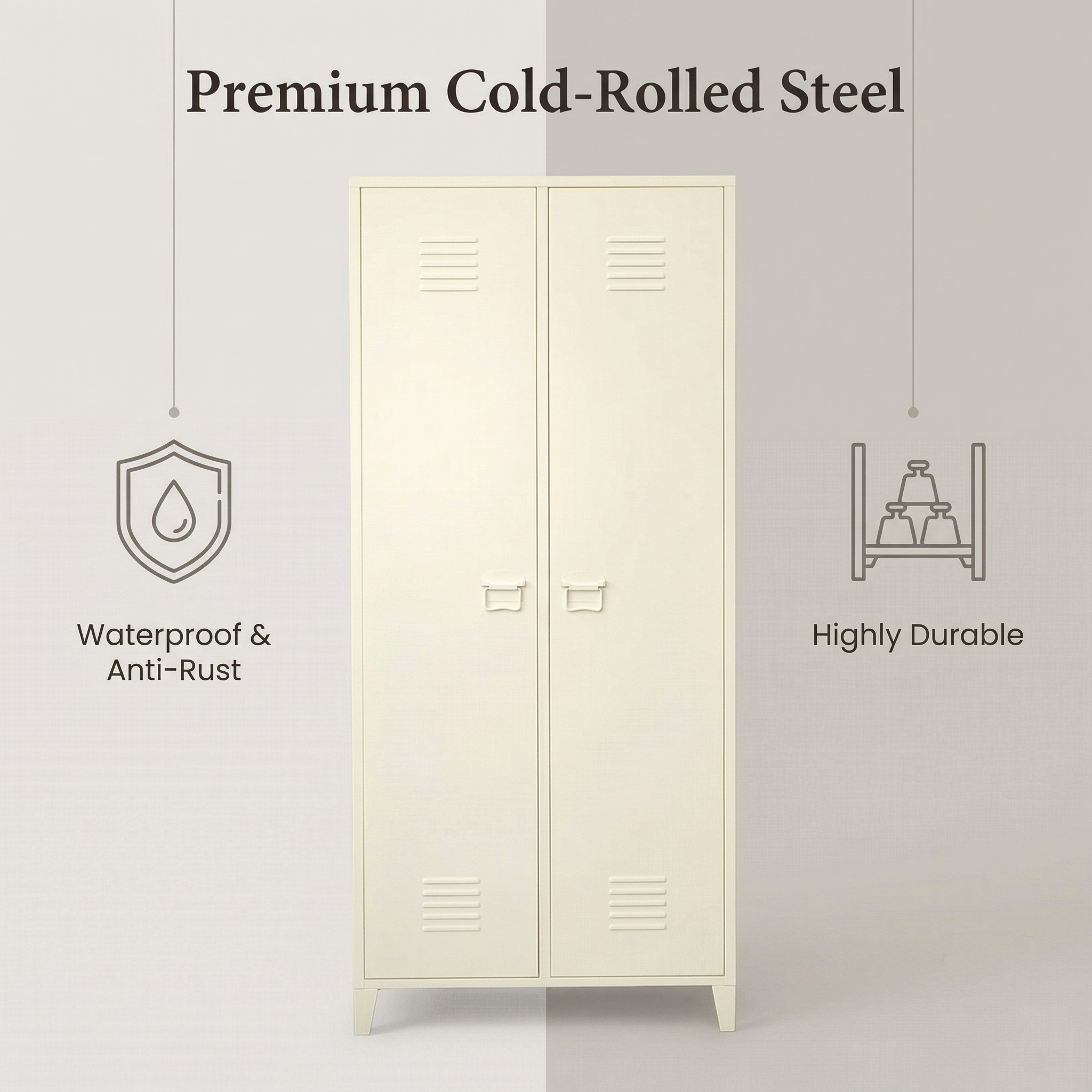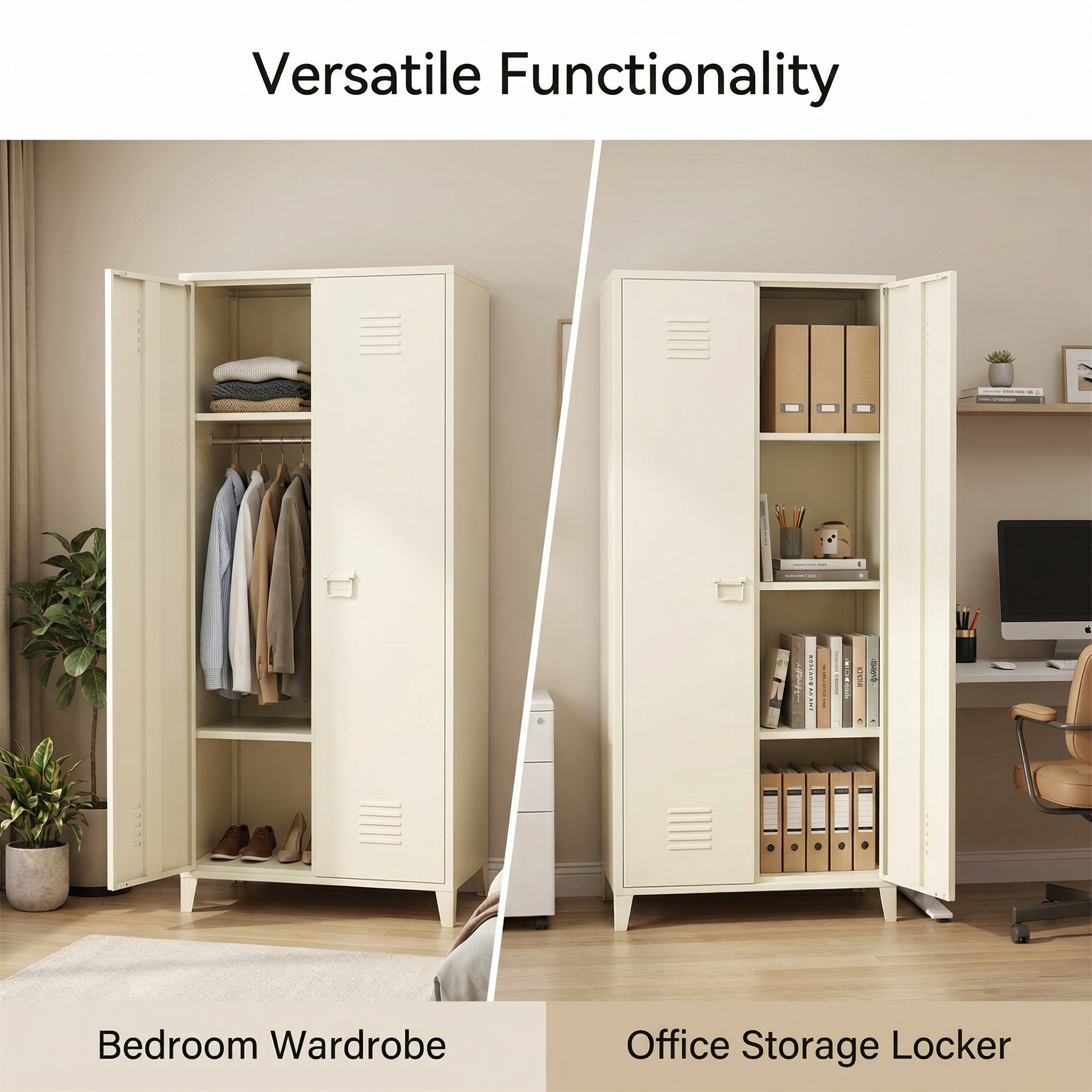 Description:Cream white 2-door steel storage locker, elevated legs, ventilation design, with hanging rod and adjustable shelves, ideal for home and office use.