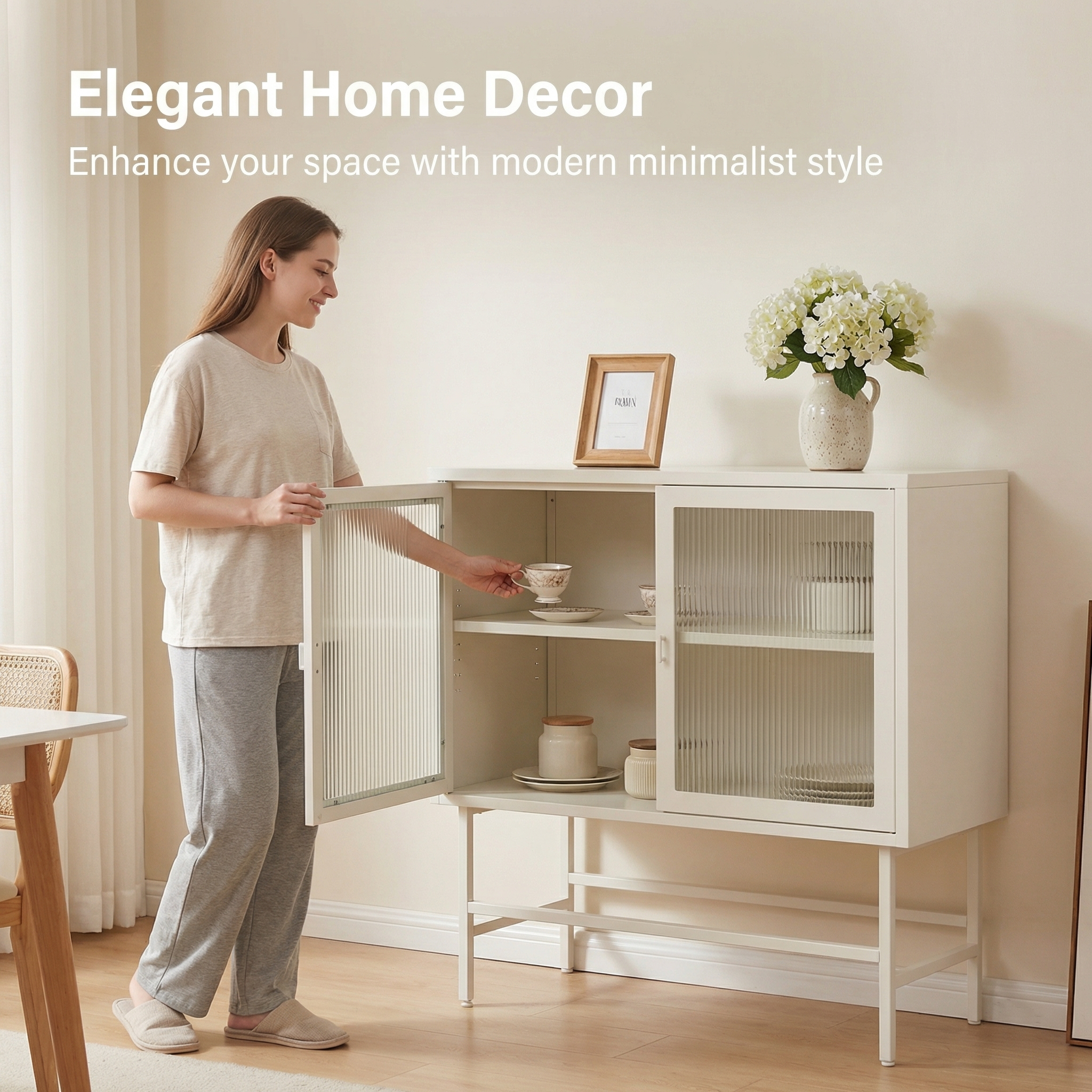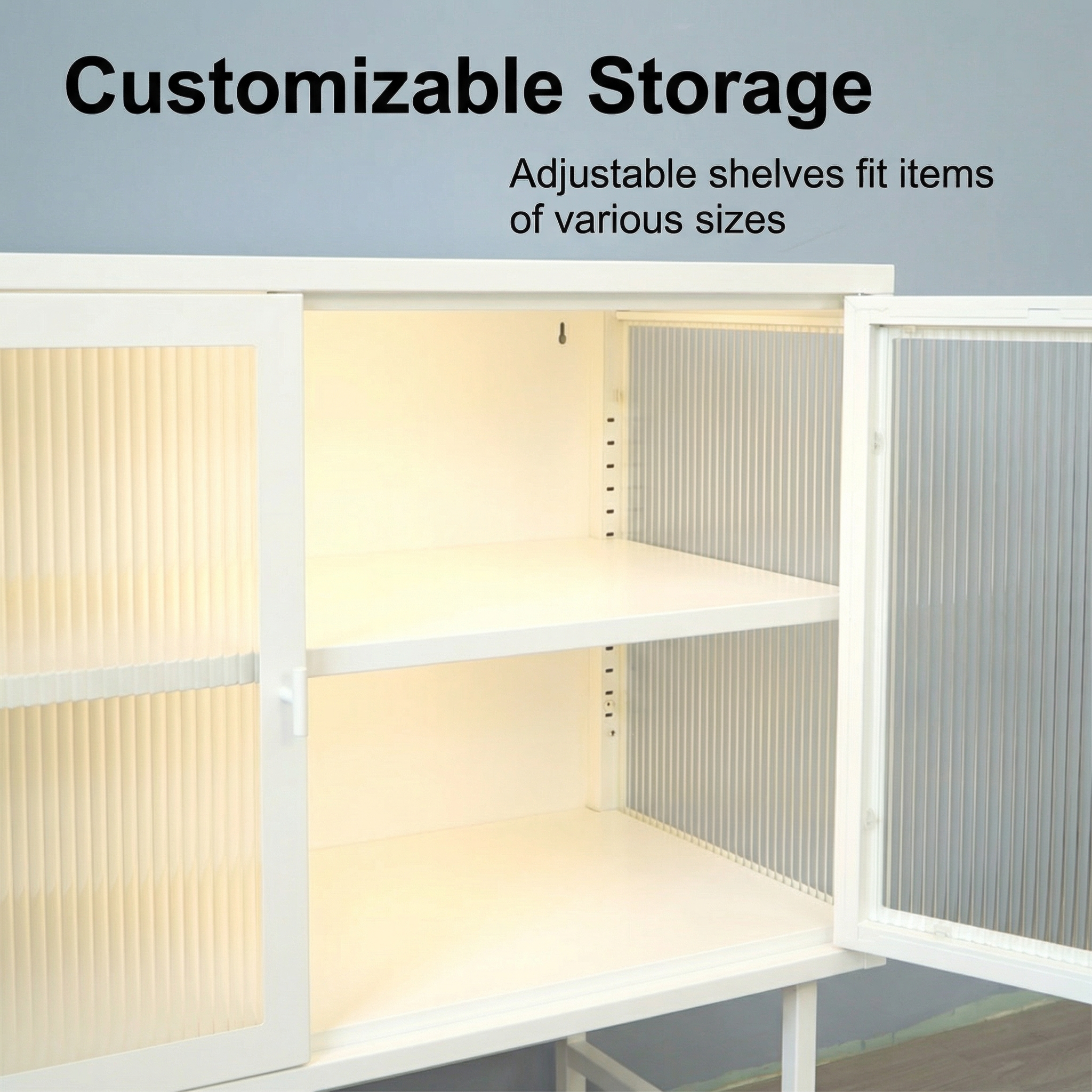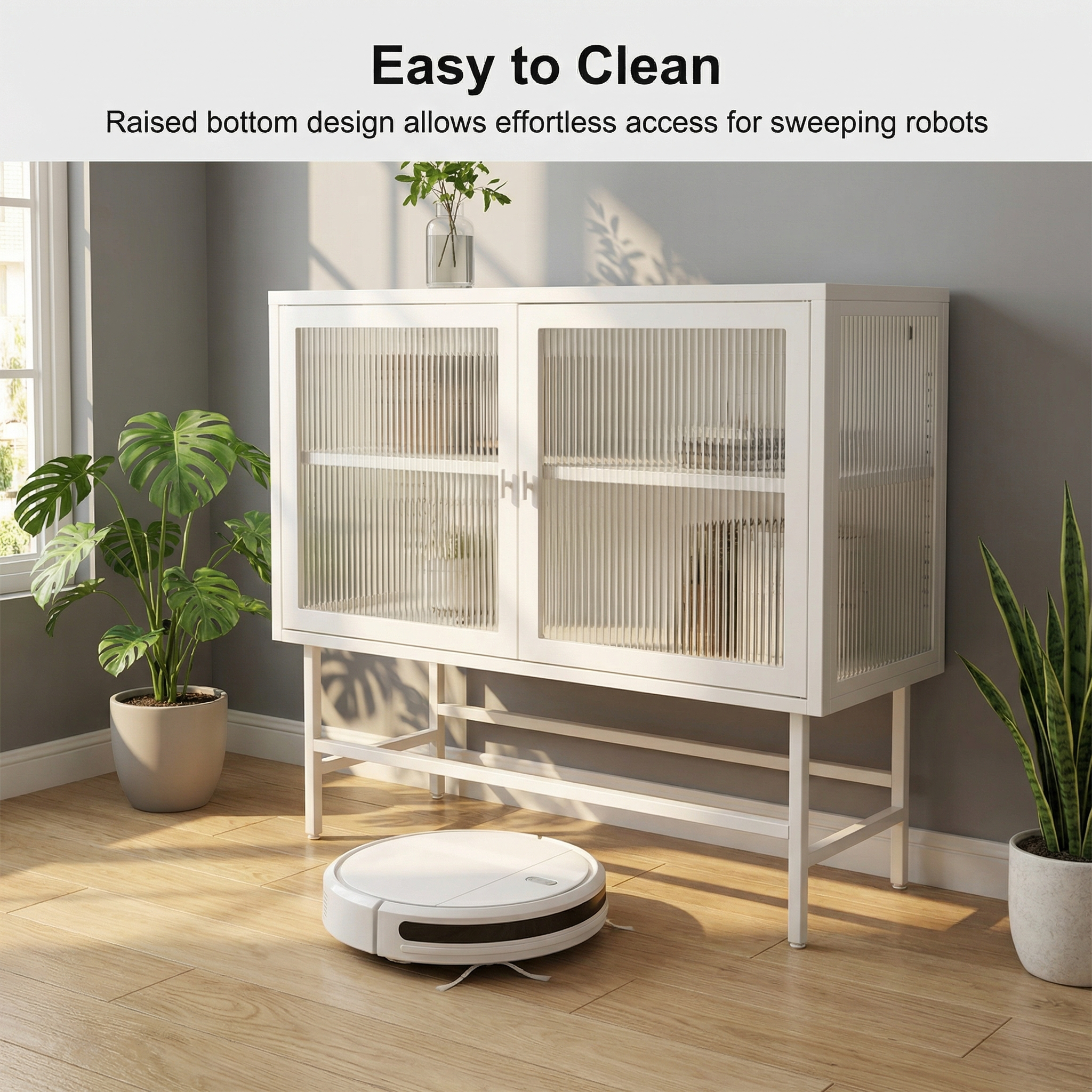 Description:Modern minimalist steel fluted glass cabinet, elevated leg design, dust-proof with adjustable shelves, perfect for living room dining room storage and decoration.