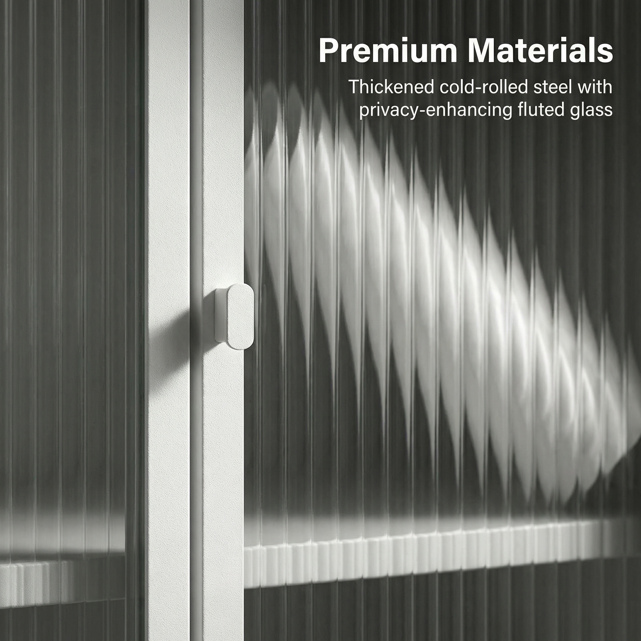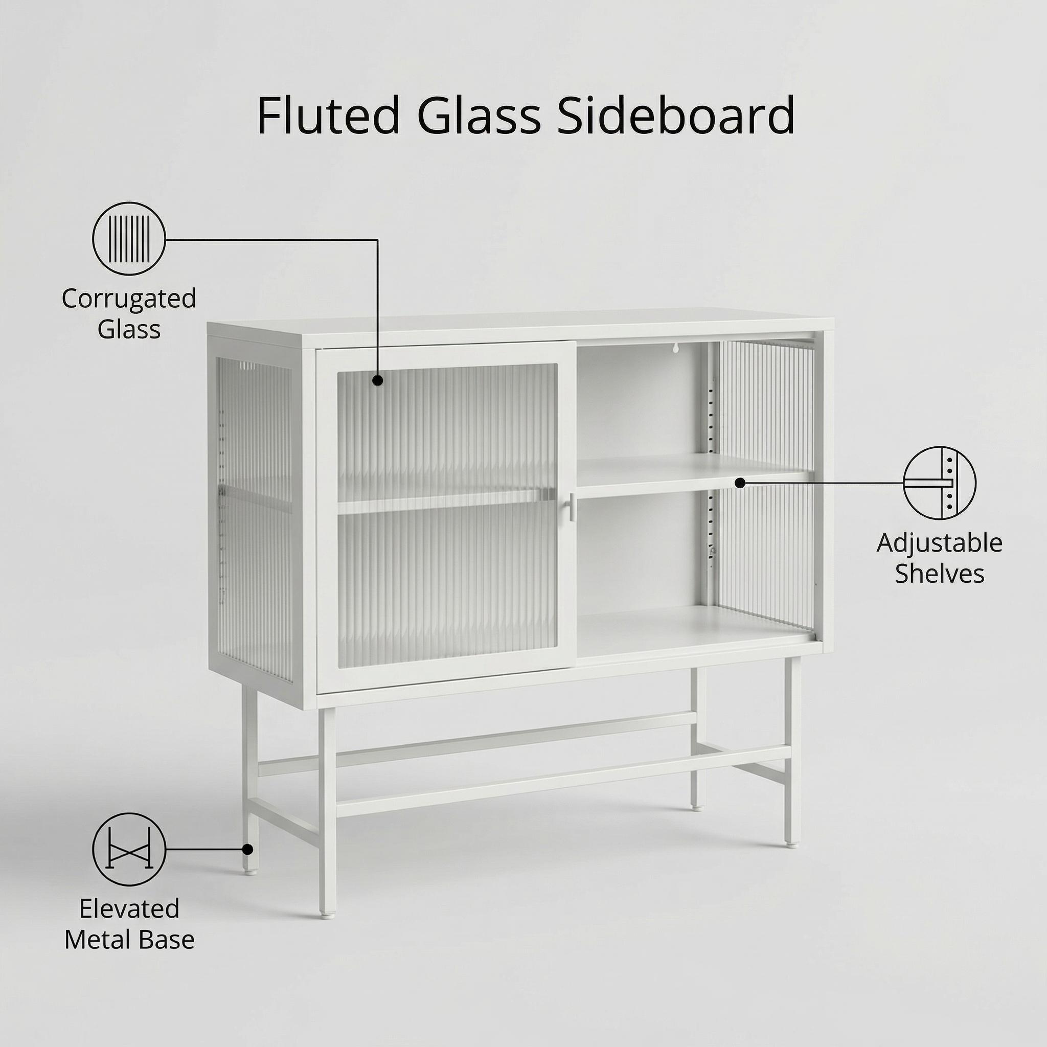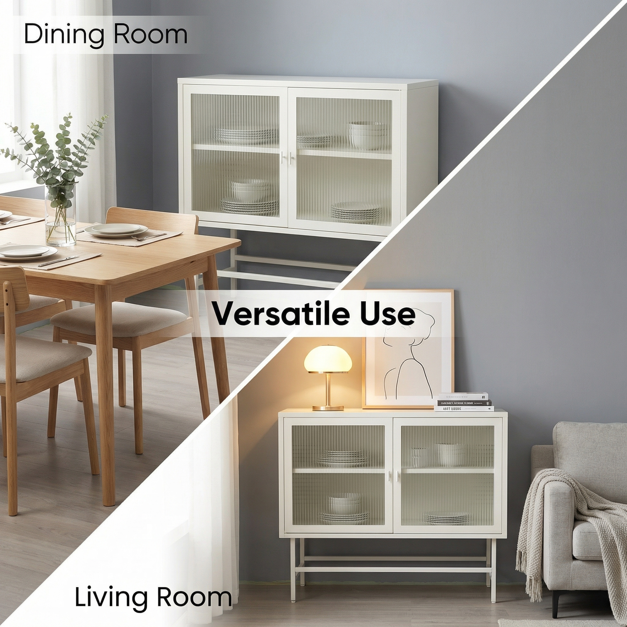 Description:Modern minimalist steel fluted glass cabinet, elevated leg design, dust-proof with adjustable shelves, perfect for living room dining room storage and decoration.