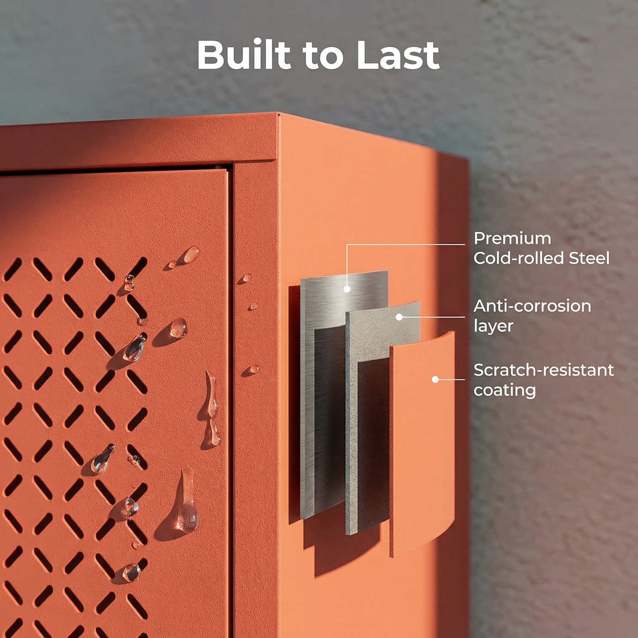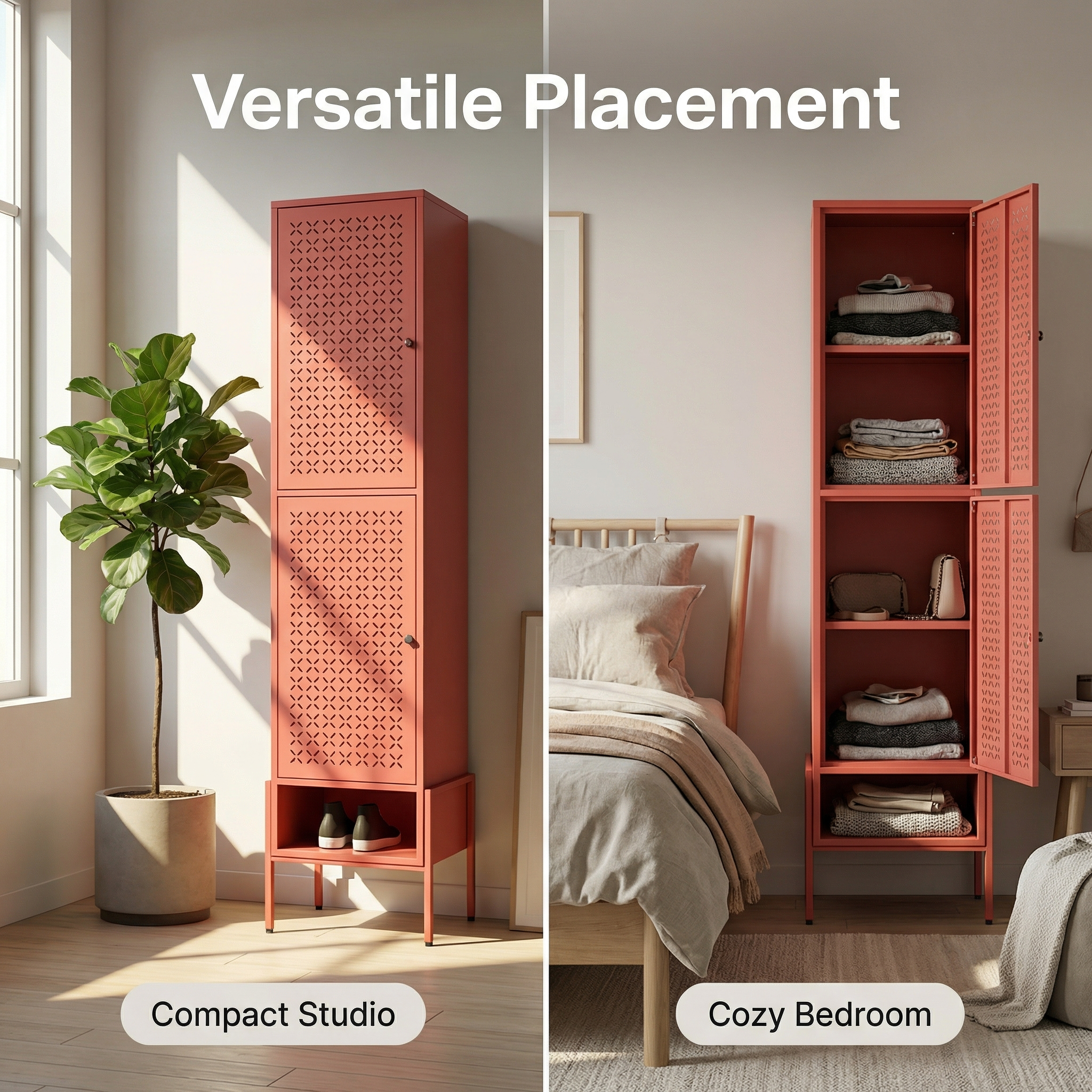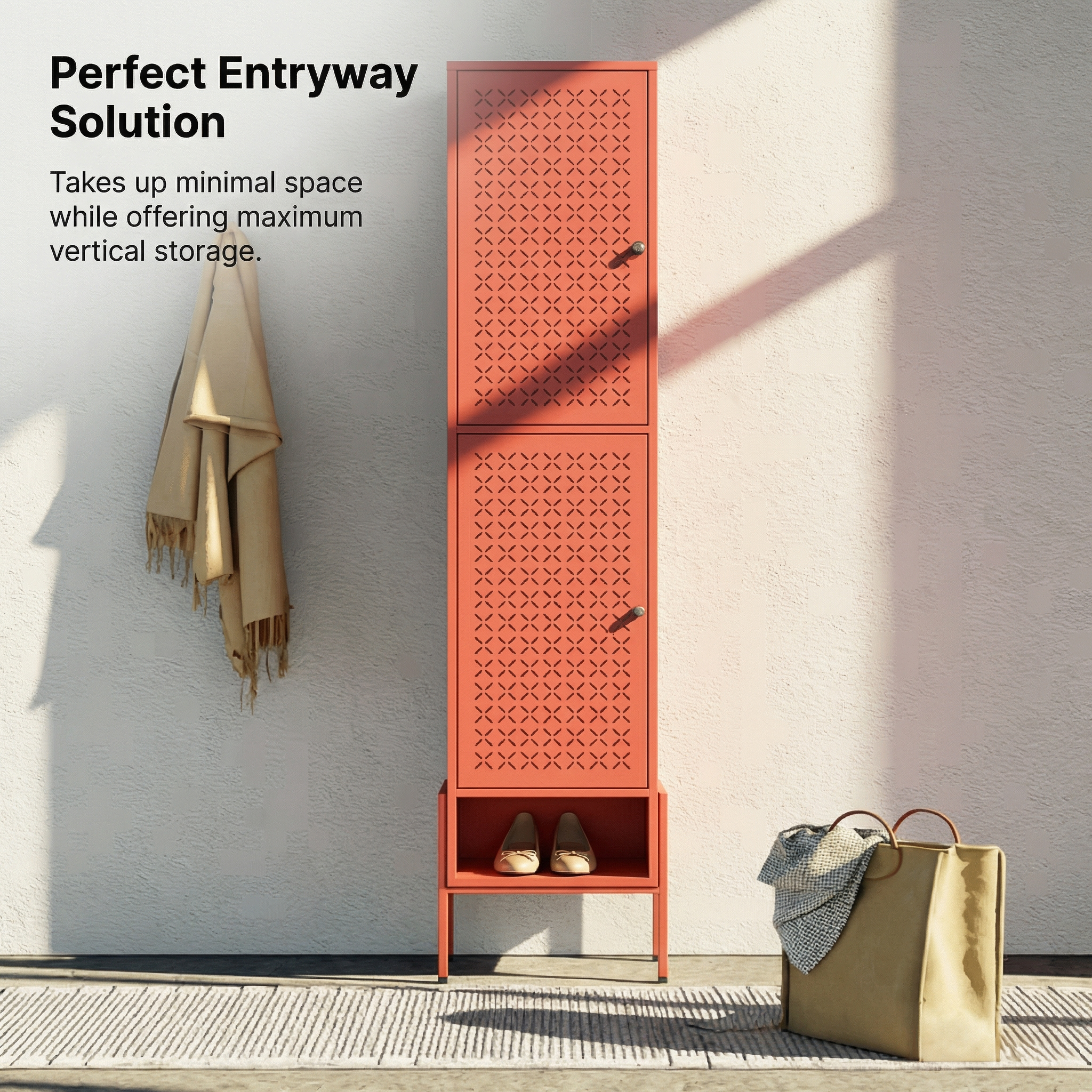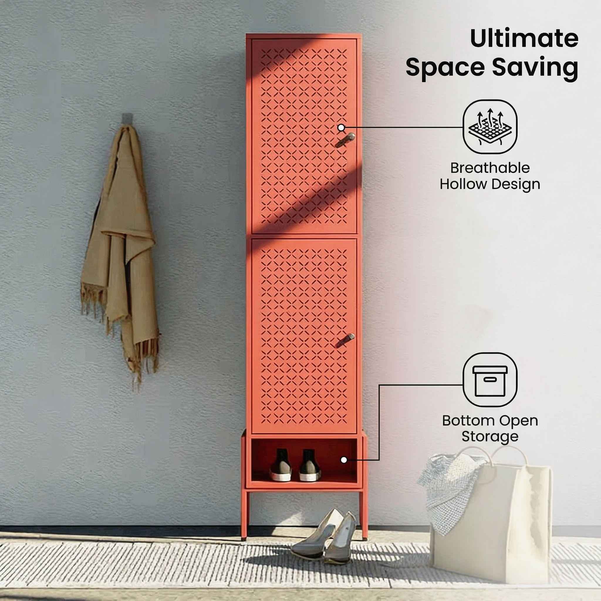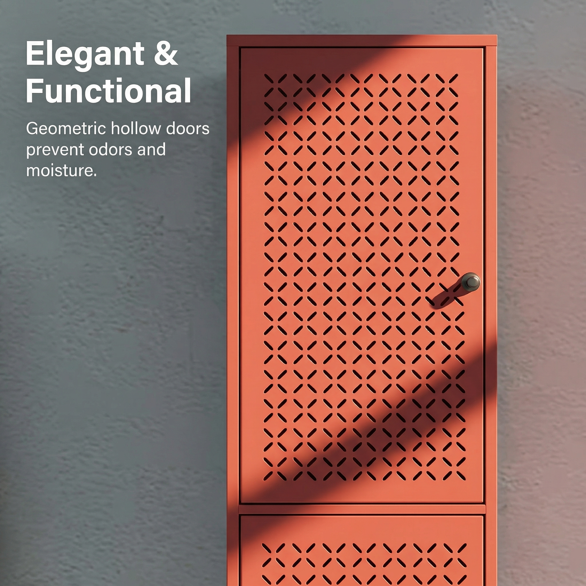 Description:Luxury hollow punched all-steel shoe cabinet with elevated legs for moisture-proof and easy cleaning. Features bottom open storage, available in solid & two-tone colors, space-saving slim body, combines dust-proof, ventilation, storage and decoration.