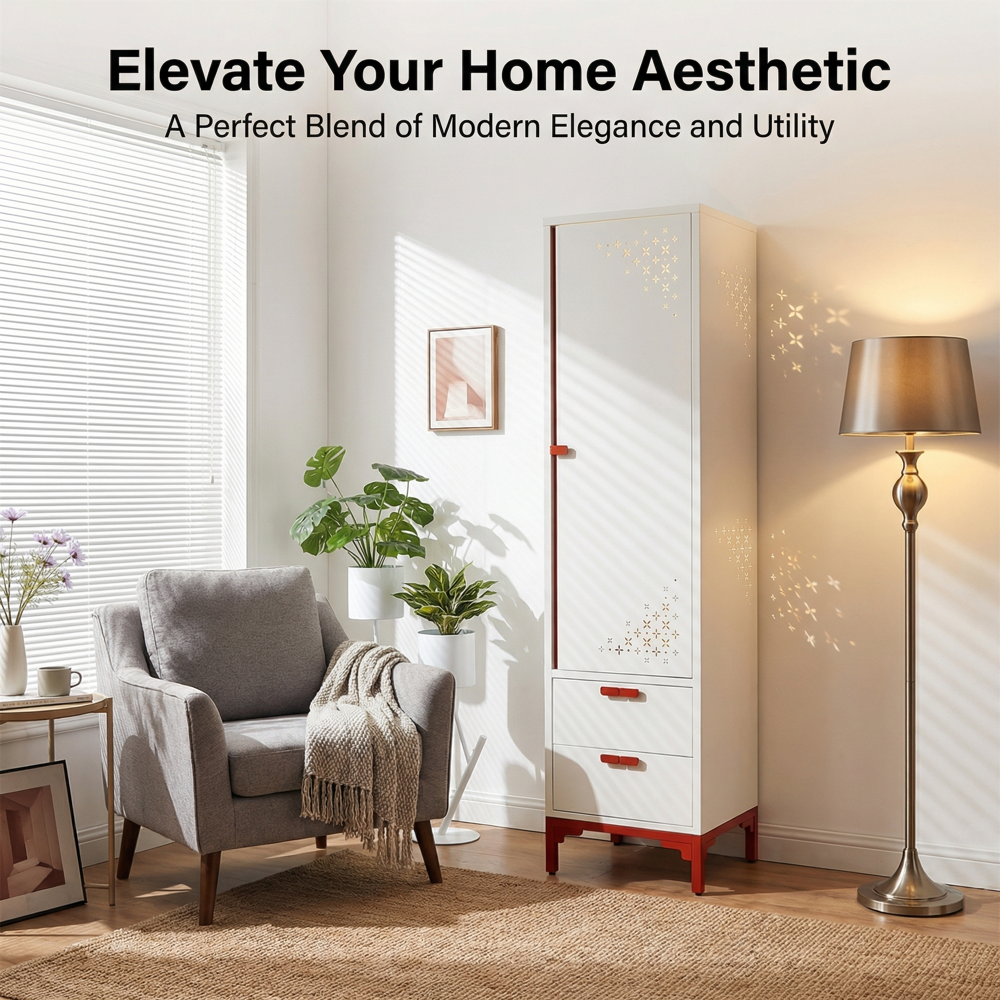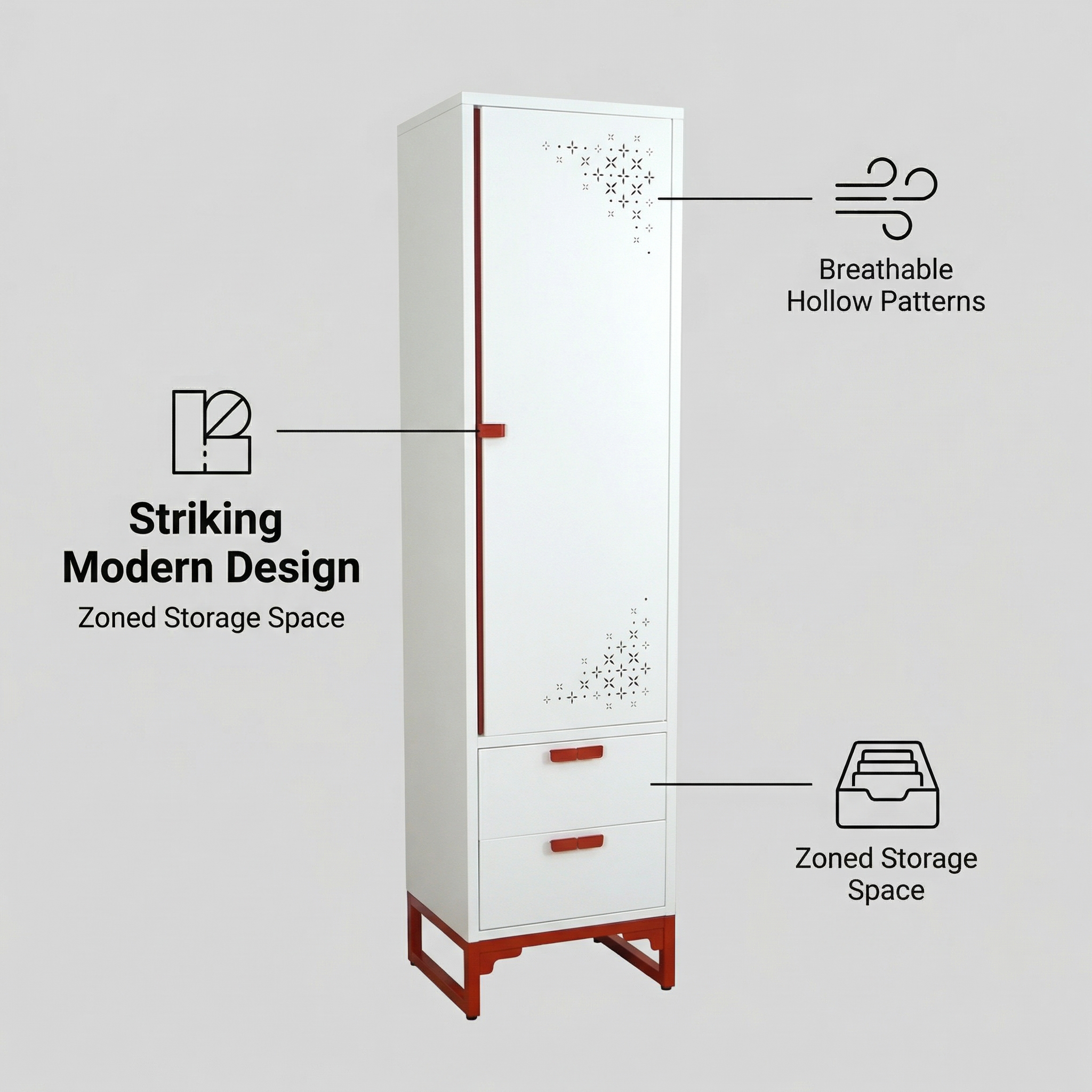 Description:White & Red/Pink Narrow Tall Cabinet, 2 Separate Doors, Four-leaf Hollow Carved, New Chinese Style Steel Storage Cabinet