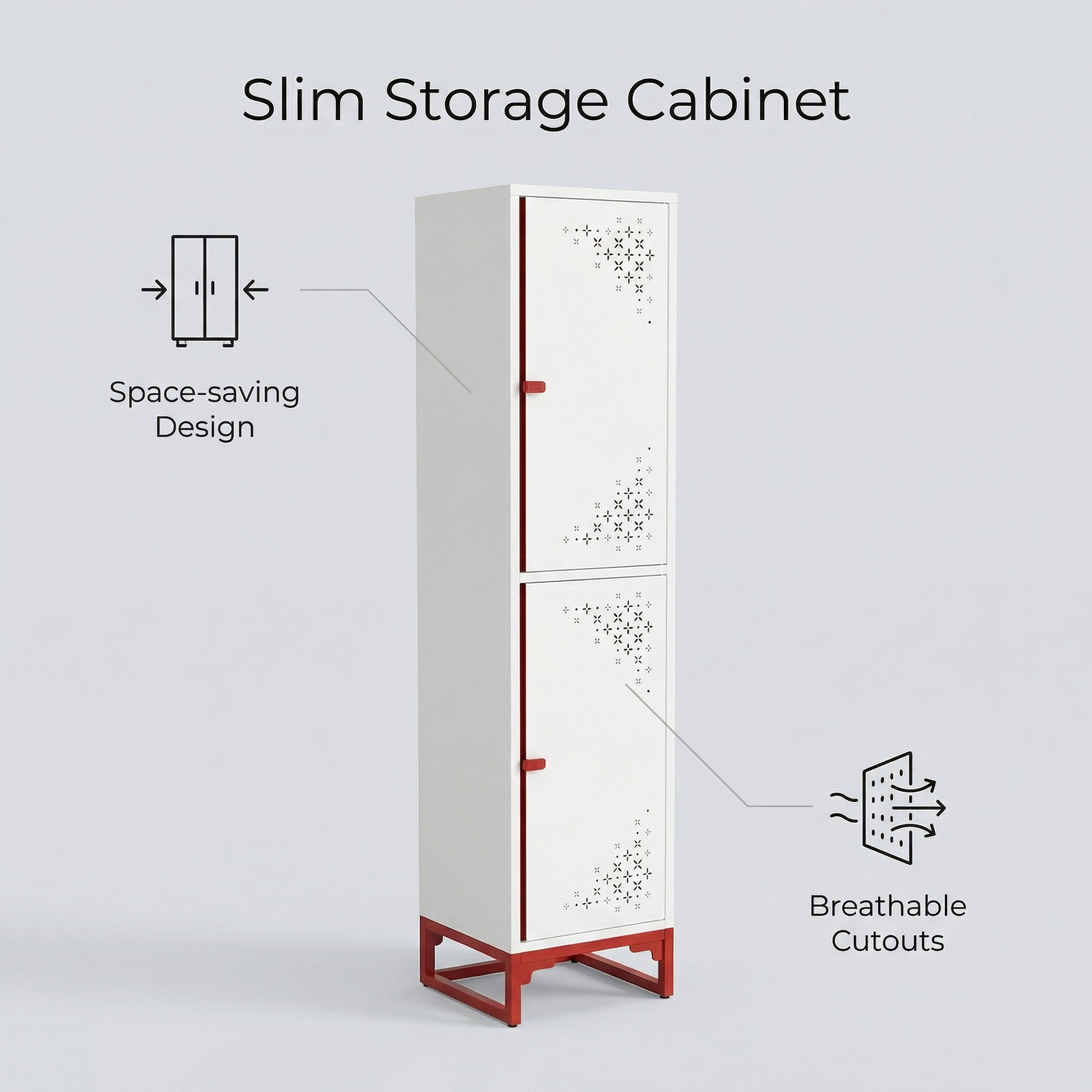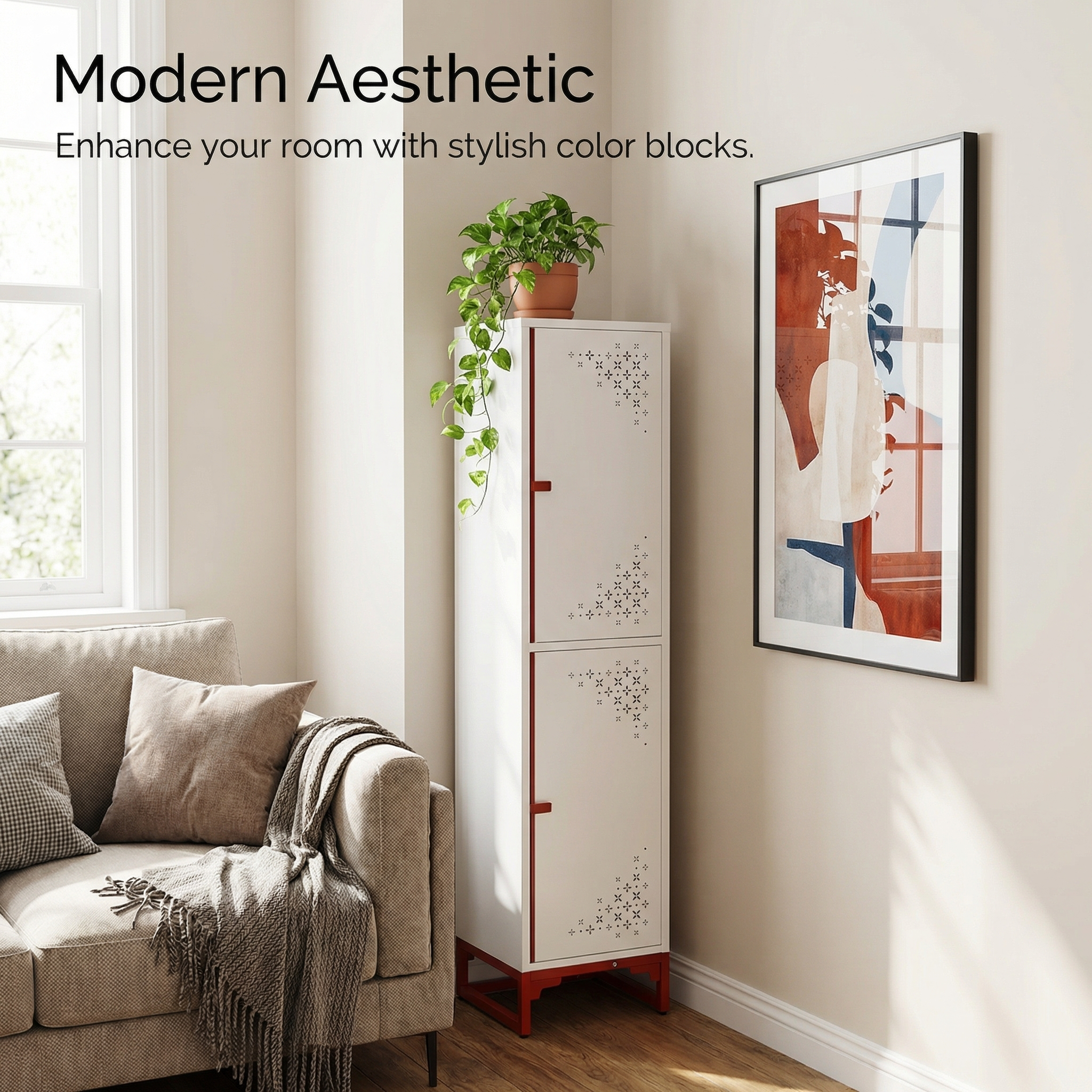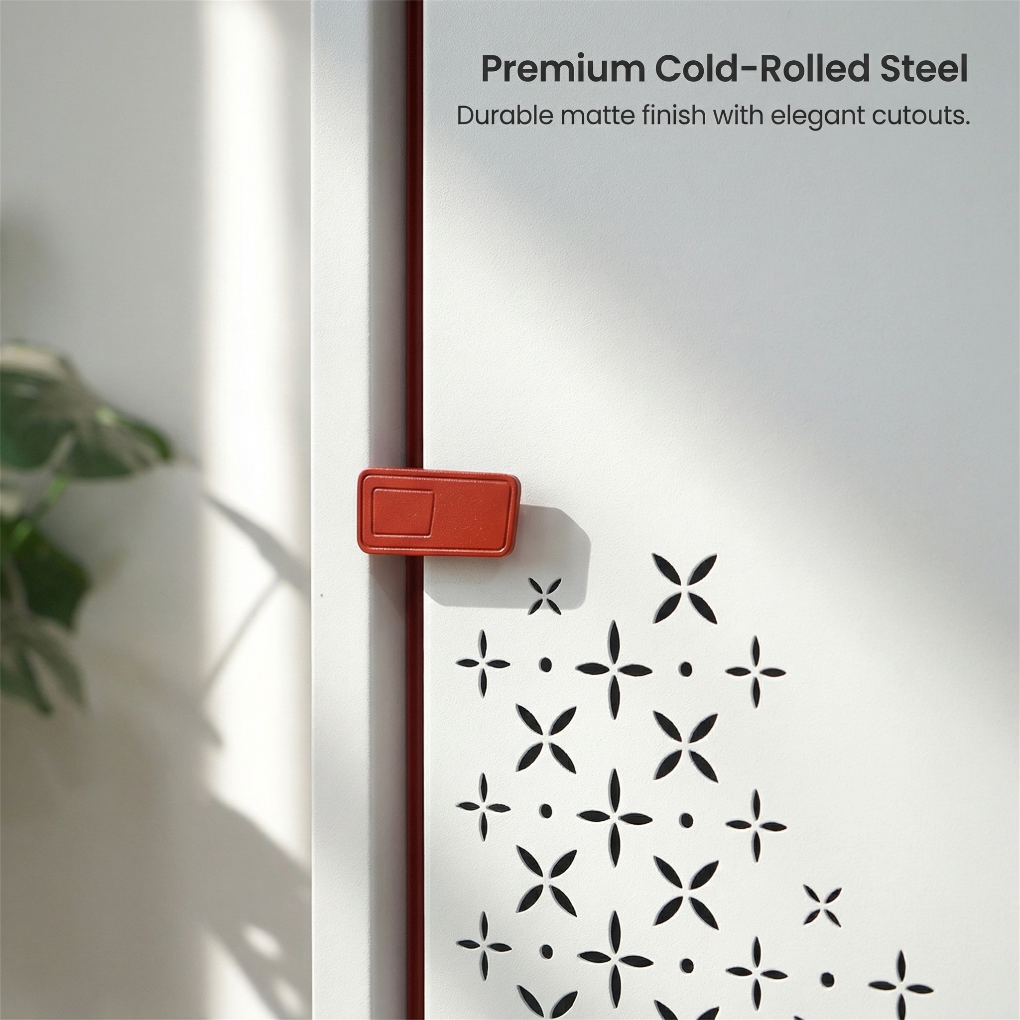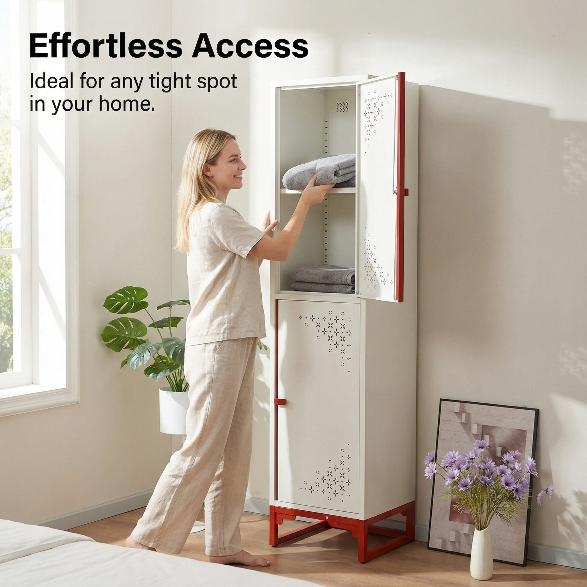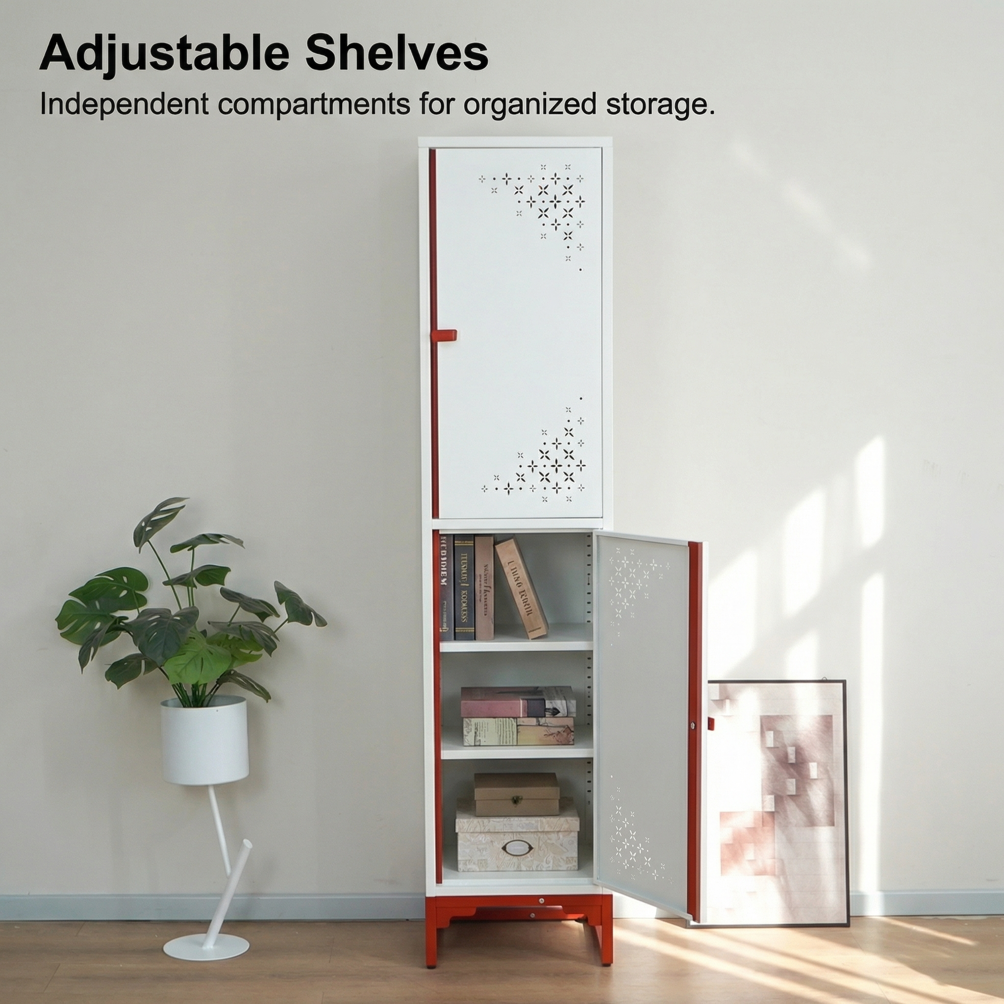 Description:White & Red/Pink Narrow Tall Cabinet, 2 Separate Doors, Four-leaf Hollow Carved, New Chinese Style Steel Storage Cabinet
