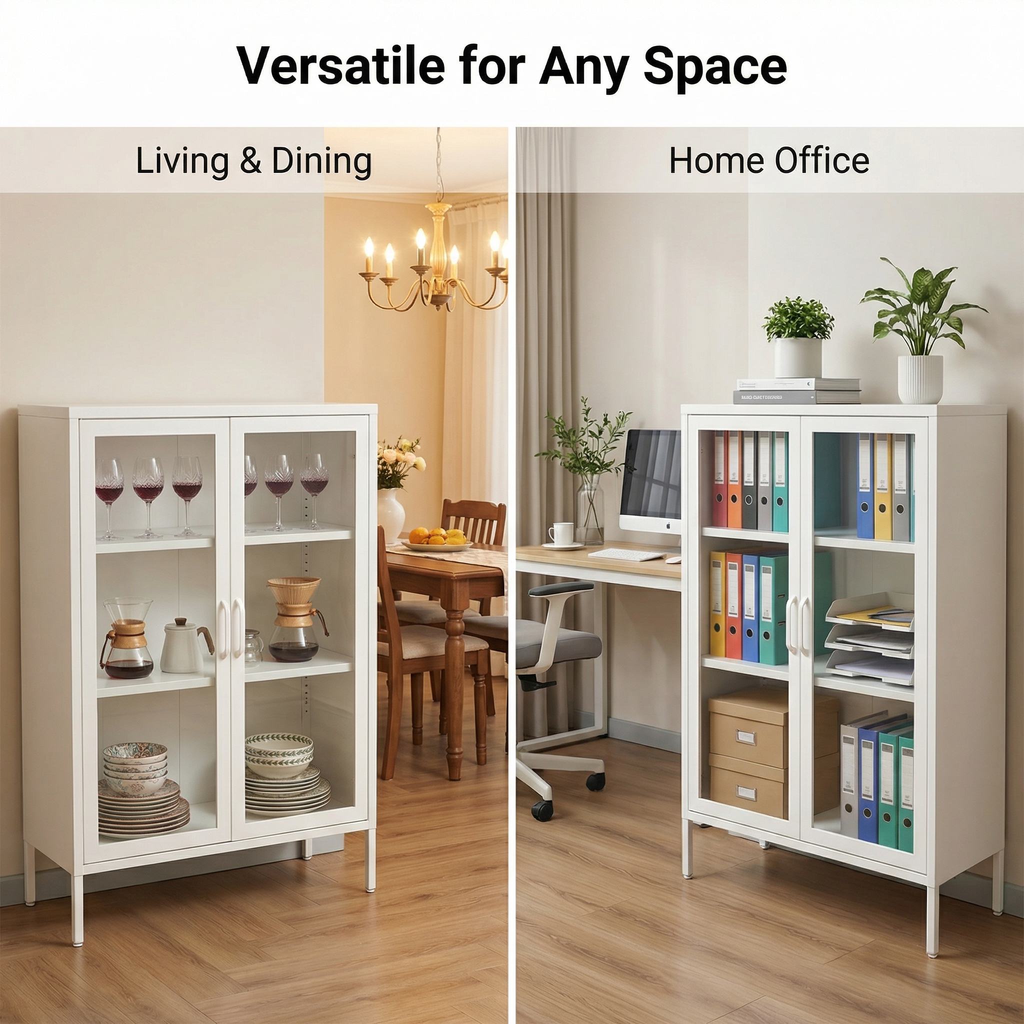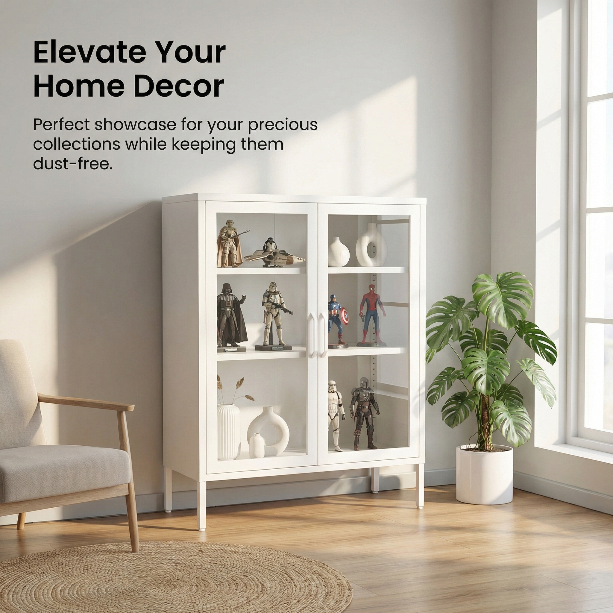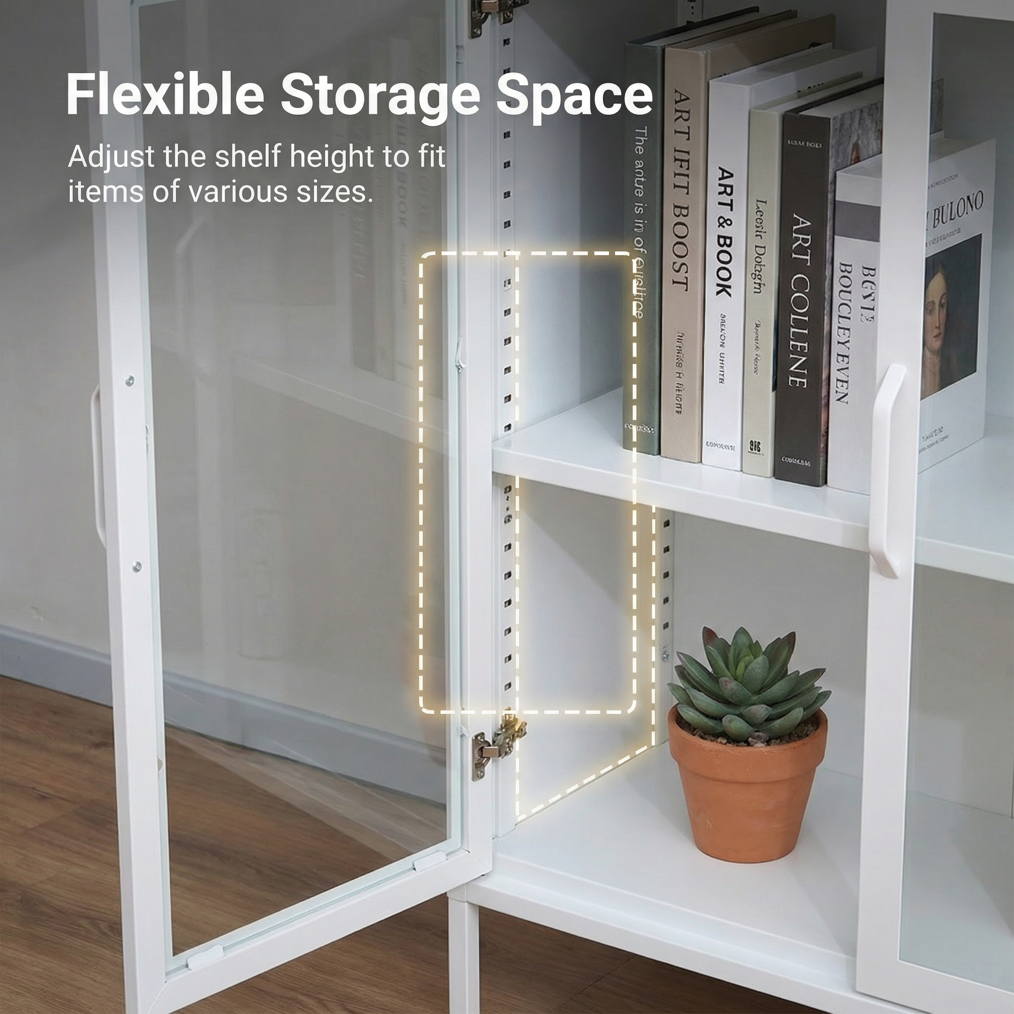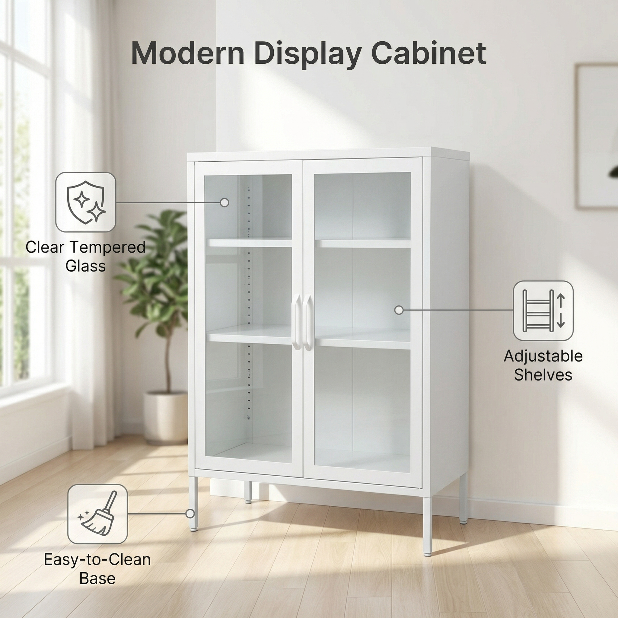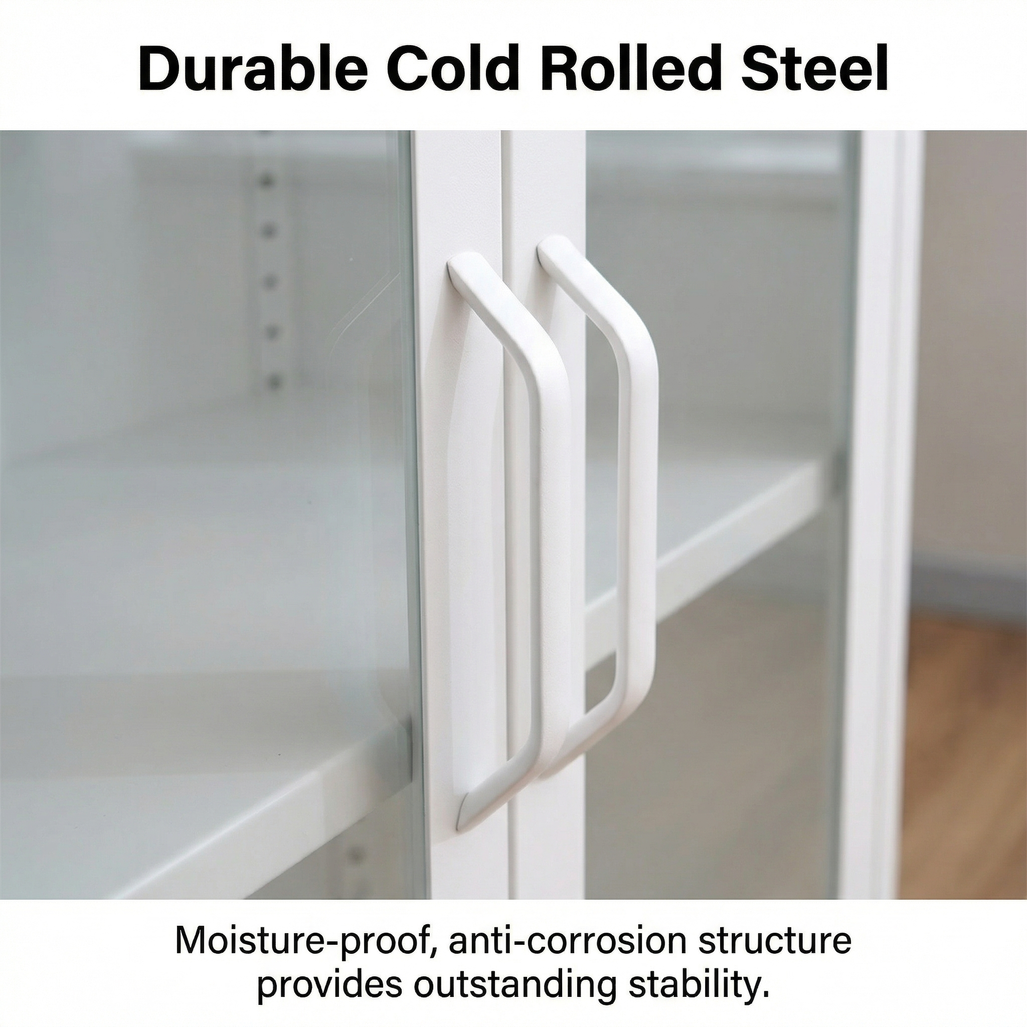 Description:White steel storage cabinet with double tempered glass doors, adjustable shelves, slim legs, modern minimalist style for living room, study and bathroom.